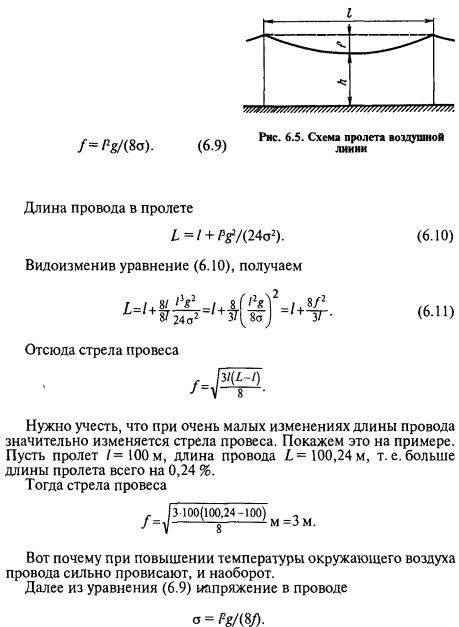 МЕХАНИЧЕСКИЙ РАСЧЕТ ПРОВОДОВНа рисунке 6.5 изображена схема пролета воздушной линии, расположенной на местности без больших разностей уровней. Длиной пролета, или пролетом l, называют горизонтальное расстояние между точками крепления провода. Гибкая натянутая между двумя точками нить всегда провисает. Стрелой провеса f называют расстояние по вертикали между горизонталью, соединяющей точки крепления провода, и низшей точкой провода. Габаритом линии h называют наименьшее расстояние по вертикали от провода при его наибольшем провисании до поверхности земли, воды, крыш зданий, головки рельса и т. п. Гибкая нить, подвешенная в двух точках, подчиняется математическому закону цепной линии. Стрела провеса, м,