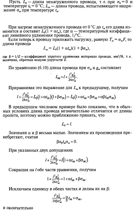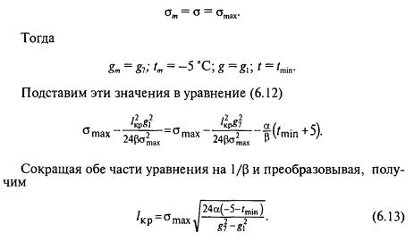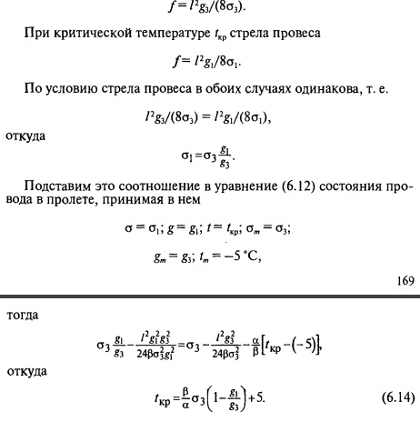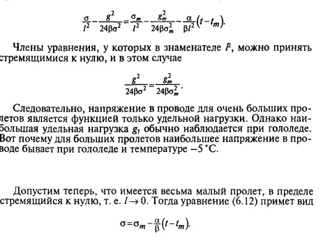 В этом случае напряжение в проводе зависит только от температуры и, следовательно, для весьма малых пролетов наибольшее напряжение возникает при минимальной температуре и отсутствии гололеда. Очевидно, существует пролет, при котором напряжения в проводе при гололеде и температуре —5 "С и без него и минимальной температуре одинаковы. Как указывалось ранее, такой пролет называется критическим. Когда известен критический пролет, достаточно сравнить с ним пролет, подлежащий расчету. Если заданный пролет больше критического, то по предьщущему наибольшее напряжение в проводе будет при гололеде и температуре —5 °С; наоборот, если заданный пролет меньше критического, то наихудший случай будет при минимальной температуре без гололеда. Для вывода уравнения критического пролета используют уравнение (6.12) состояния провода в пролете. Пусть члены уравнения с индексом т относятся к режиму гололеда и температуре —5 °С, а без индексов — к режиму с минимальной температурой без гололеда. При критическом пролете напряжение в проводе в обоих режимах одинаково и равно максимальному, т. е.