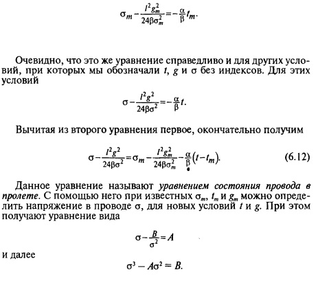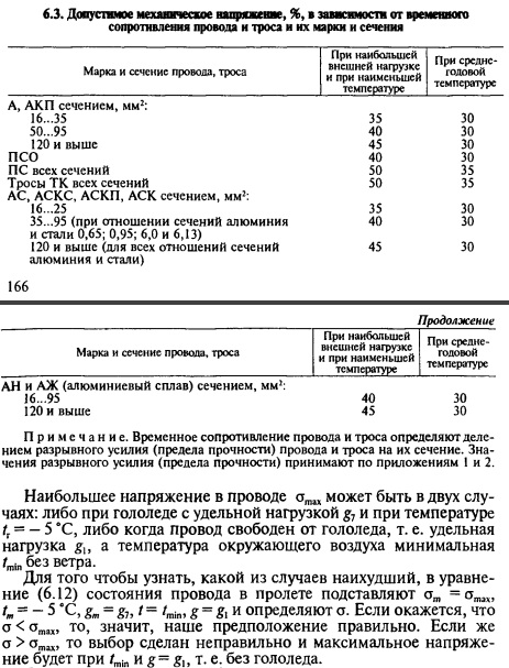 Такое кубическое уравнение можно решить подбором. Если приходится выполнять большое число расчетов, то целесообразно применять способы, облегчающие решение уравнения. При использовании уравнения состояния провода в пролете основной исходной величиной служит максимально допустимое механическое напряжение для материала проволок. Его определяют по данным таблицы 6.3.