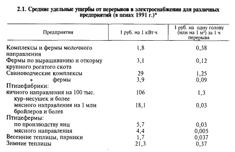 НАДЕЖНОСТЬ ЭЛЕКТРОСНАБЖЕНИЯ И СРЕДСТВА ДЛЯ ПОВЫШЕНИЯ ЕЕ УРОВНЯВ связи с серьезными количественными и качественными изменениями сельскохозяйственных потребителей электроэнергии значительно возросла актуальность задачи обеспечения надежного электроснабжения. Это связано с появлением сельскохозяйственных предприятий промышленного типа, в первую очередь животноводческих комплексов. В таблице 2.1 приведены некоторые данные по средним удельным ущербам на различных сельскохозяйственных предприятиях от перерывов в электроснабжении.