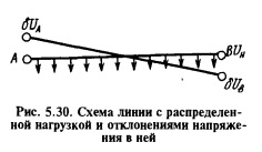 ОПРЕДЕЛЕНИЕ ДОПУСТИМОЙ ПОТЕРИ НАПРЯЖЕНИЯ В СЕТИРанее приведены способы расчета воздушных электрических сетей с проводами из разных материалов по потере напряжения. Допустимую потерю напряжения в электрической сети определяют по допустимым отклонениям напряжения у потребителей. Поэтому рассмотрению вопроса об отклонениях напряжения уделено значительное внимание. Отклонения напряжения и их влияние на работу приемников электроэнергии. Электрическая нагрузка никогда не остается постоянной. Вследствие этого изменяется потеря напряжения в линии, а следовательно, напряжение у потребителя. Постепенные изменения напряжения, вызываемые изменениями нагрузки в течение суток и года, называются отклонениями напряжения в отличие от кратковременных понижений напряжения, происходящих, например, при пусках короткозамкнутых электродвигателей. Отклонение напряжения — это алгебраическая разность между напряжением в данной точке при данном режиме и номинальным напряжением сети. Отклонения напряжения выражают в вольтах или в процентах от номинального напряжения сети. Пусть есть линия (рис. 5.30) с распределенной нагрузкой, выполненная проводом постоянного сечения. Напряжение вдоль линии изменяется приблизительно по прямой (более точно — по квадратичной кривой). В начале линии (точке А) оно несколько выше номинального, а в конце (точке В) ниже него. Отклонение напряжения в вольтах в начале линии