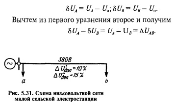 Таким образом, с увеличением напряжения растут световой поток и световая отдача лампы, резко сокращается срок ее службы. Так, при напряжении 105 % номинальный срок службы лампы сокращается в 2 раза и для стандартной лампы составляет 480 ч вместо 1000 ч. При пониженном напряжении снижается световой поток и, следовательно, ухудшаются условия освещения. При напряжении 95 % номинального световой поток лампы составляет всего 81,5 %. Отклонения напряжения для ламп накаливания весьма нежелательны, и следует стремиться к тому, чтобы они были как можно меньшими. Люминесцентные лампы, или лампы дневного света, меньше реагируют на изменения напряжения, чем лампы накаливания. В среднем можно считать, что на +1 % изменения напряжения их световой поток изменяется также на ± 1 %, а световая отдача — всего на ±0,5 %. Однако при напряжении 93...94 % номинального лампа не загорается. Нагревательные бытовые приборы (плитки, утюги) сравнительно мало реагируют на отклонения напряжения. Все же следует учитывать, что их электрическая мощность изменяется прямо пропорционально квадрату изменения напряжения. Это значит, что, например, при напряжении 90 % номинального электрический утюг мощностью 400 Вт развивает мощность всего 324 Вт. Работа асинхронных электрических двигателей также зависит от значения напряжения. Особенно важно, что при этом прямо пропорционально квадрату напряжения изменяется вращающий момент. Поэтому при снижении напряжения нормально загруженные двигатели останавливаются — опрокидываются. Кроме того, изоляция двигателей выходит из строя. Таким образом, электрические сети нужно проектировать так, чтобы отклонения напряжения у потребителей не выходили за допустимые пределы. В действующих нормах установлено, что в сельских сетях напряжение на зажимах токоприемников не должно повышаться больше чем на 5%и снижаться также больше чем на 5% номинального напряжения сети. Электрическую сеть проектируют так, чтобы наибольшие отклонения напряжения не превосходили приведенных значений, но в то же время были как можно ближе к ним, иначе потребуется затратить в сети лишнее количество металла проводов. Потеря напряжения в линии непосредственно связана с отклонениями напряжения. Для линии, приведенной на рисунке 5.31, отклонения напряжения выражают как