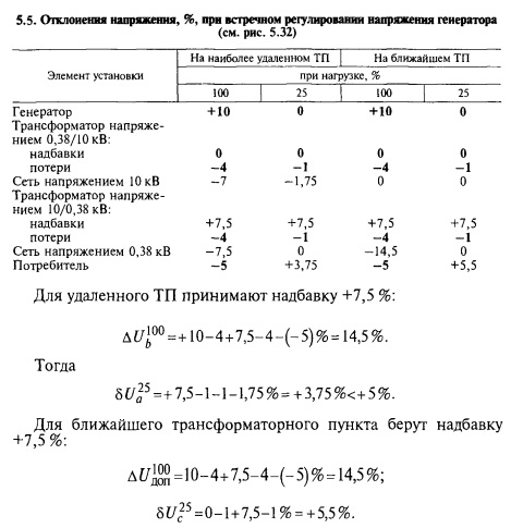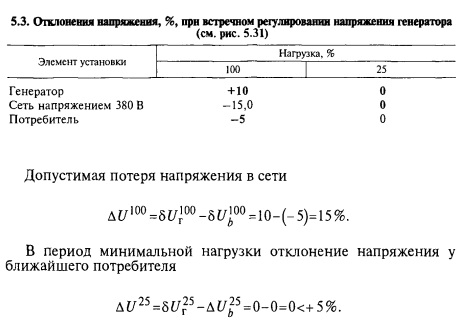 Вносят жирным шрифтом в таблицу известные значения: отклонения напряжения на генераторе, надбавки повышающего трансформатора напряжением 10/0,38 кВ, равные нулю, и потери напряжения в трансформаторах, которые при полной нагрузке можно считать равными 4 %, а при 25 % полной нагрузки — 1 %. Кроме того, учитывают допустимые отклонения напряжения у потребителя при полной нагрузке. При значительной недогрузке трансформатора потери напряжения в них подсчитывают по формулам этого параграфа. Затем задаются надбавкой трансформатора напряжением 10/0,38 кВ, которая, как указывалось ранее, может быть от +10 до 0 %. Выбирают надбавку, равную +5 %. Тогда допустимая потеря напряжения в сетях напряжением 10 и 0,38 кВ при полной нагрузке