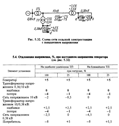 Для трансформаторов, применяемых в сельских установках, при типичной загрузке и коэффициенте мощности потерю напряжения принимают в среднем =(4...5)%. Эту величину и берут для приблизительных расчетов. Более точный расчет делают по формулам (5.99)...(5.103). В трансформаторах происходит не только потеря напряжения, но и повышение — надбавка напряжения. Рассмотрим сначала работу обычного трансформатора при нормальном режиме на понижающей подстанции. Трансформатор по стандарту выполняют так, что если к первичной обмотке подведено напряжение 100 %, то при холостом ходе на вторичной обмотке будет напряжение 105 % (например, 35/10,5, 10/0,4 кВ). Таким образом, за счет коэффициента трансформации получается постоянная надбавка +5 %*. Кроме того, в обмотке высшего напряжения есть пять ответвлений через 2,5 % витков. Установка на среднее ответвление соответствует надбавке 0 %. Установка на крайние ответвления дает переменные надбавки +5 % или -5 %, прибавляющиеся к постоянной надбавке. В сумме постоянная и переменные надбавки дают общую надбавку, которая в зависимости от установленного ответвления составляет + 10; +7,5; +5; +2,5; 0 %. При установке трансформатора его можно присоединить любым ответвлением. Задача проектировщика — указать монтажнику наиболее выгодное ответвление. В разные сезоны года при изменении нагрузки можно переключать ответвления. На сельских электростанциях обычные понижающие трансформаторы используют также в качестве повышающих. В этом случае, если подвести к первичной обмотке напряжение 105 %, то во вторичной обмотке будет 100 %, если подвести к первичной обмотке 100 %, то во вторичной будет 95 % и т.д. Таким образом, постоянная надбавка оказывается здесь уже отрицательной (-5 %). Переменные надбавки по значению остаются такими же, как и в предыдущем случае, только меняются местами, а общая надбавка в зависимости от установки ответвления может иметь значения 0; -2,5; -5; -7,5; -10 %. Поскольку пониженное напряжение невыгодно, в этих случаях всегда принимают надбавку 0%. Определение допустимой потери напряжения. Допустимую потерю напряжения в воздушной сети определяют из таблиц отклонений напряжения, составляемых для данной схемы сети. Порядок построения таблиц отклонений напряжения лучше всего можно усвоить на конкретных примерах. Электрическая станция с сетью низкого напряжения. Пример такой сети — сеть небольшой сельской электростанции (см. рис. 5.31). Хотя мелкие станции не являются основными в развитии сельского электроснабжения, они могут оказаться необходимыми, например для электрификации небольших поселков в северной зоне страны. Как указывалось в предыдущем параграфе, возможны два режима работы генератора электростанции: постоянного напряжения и встречного регулирования напряжения. Рассмотрим каждый из них в отдельности. 1. Режим постоянного напряжения на генераторе. Пусть в этом режиме поддерживают неизменное напряжение, т.е.