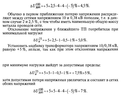Установить надбавку трансформатора напряжением 10/0,38 кВ + + 0 нецелесообразно, так как допустимая потеря напряжения уменьшится на 2,5 % и, таким образом, возможности сети не будут использованы. Рассмотрим теперь трансформаторный пункт, ближе всего расположенный к электрической станции. Можно предположить, что он расположен очень близко и потерей напряжения в сети напряжением 10 кВ до него можно пренебречь. Для сетей, расположенных между ближайшим и наиболее удаленным ТП, значение допустимой потери напряжения в сети напряжением 0,38 кВ приблизительно пропорционально их удаленности от электростанции. В данном случае также применим надбавку на трансформаторе напряжением 10/0,38 кВ+ 2,5 %, и тогда допустимая потеря напряжения в сети напряжением 0,38 кВ ближайшего ТП составит: