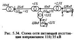 Наносят необходимые данные на схему сети (см. рис. 5.33). Питание от шин подстанции напряжением 110/35 кВ или ответвление от линии напряжением 35 кВ. Такая схема электроснабжения наиболее распространена. Так же как в предыдущем случае, отклонения напряжения в месте присоединения сельской сети могут быть различными: их определяют перед расчетом.