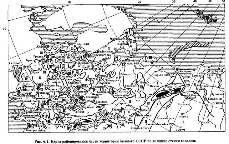 ОПРЕДЕЛЕНИЕ МЕХАНИЧЕСКИХ НАГРУЗОК НА ПРОВОДАВоздушная линия должна быть достаточно прочной, чтобы выдержать механические нагрузки. Для надежной работы проводов, опор и других конструктивных элементов их рассчитывают на механическую прочность. Механический расчет ВЛ основан на применении некоторых положений дисциплины «Сопротивление материалов», обязательных указаниях Правил устройства электротехнических установок и Строительных норм и правил (СНиП). Он необходим для правильного проектирования электрических сетей. Для различных напряжений и климатических районов страны разработаны типовые конструкции опор. Поэтому проектирование конструкций опор и механический расчет целесообразны только тогда, когда в типовых проектах отсутствуют опоры для данных условий или когда нет сортамента материалов, предусмотренного этим проектом. На провода воздушных электрических линий действуют вертикальные (собственный вес провода, вес гололеда, образовавшегося на проводе) и горизонтальные (давление ветра) нагрузки. При их учете принимают некоторые допущения: предполагают равномерное распределение нагрузок по длине провода, нагрузки считают статическими, т. е. неизменными по значению. Под действием механических нагрузок в материале провода появляются механические напряжения на растяжение. На их значение влияют также напряжения, которые возникают в проводе при уменьшении его длины, с понижением температуры. Таким образом, для определения нагрузок на провода и механических напряжений в материале необходимо знать климатические условия в районе сооружения линии (толщину слоя льда, скорость ветра, максимальную, минимальную и среднюю температуры). Наибольшие нормативные значения толщины слоя льда и скоростного напора ветра для всех линий напряжением свыше 1000 В определяют, исходя из повторяемости один раз в 10 лет, а для линий напряжением 3 кВ и ниже — один раз в 5 лет. Расчетные температуры воздуха принимают по данным фактических наблюдений независимо от напряжения ВЛ и округляют до значений, кратных пяти. Территория бывшего СССР разделена на пять районов, которые отличаются толщиной стенки гололеда (табл. 6.1). Чтобы определить, к какому району относится данная местность, следует пользоваться специальными картами (рис. 6.1).