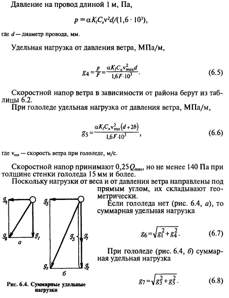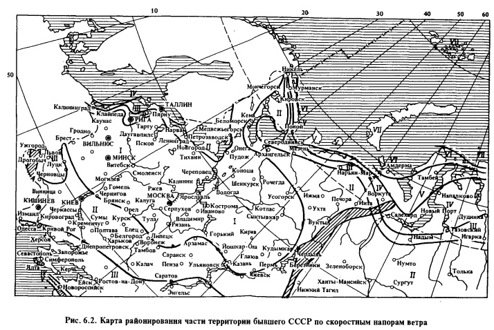 По скоростным напорам ветра территория бывшего СССР разделена на семь районов (табл. 6.2). На рисунке 6.2 приведена карта районирования части территории бывшего СССР по скоростным напорам ветра. В таблице 6.2 в скобках даны скорости ветра, соответствующие приведенным в ней скоростным напорам. Механические нагрузки на провода принято определять в единицах силы на единицу сечения и единицу длины провода. Их называют удельными механическими нагрузками.