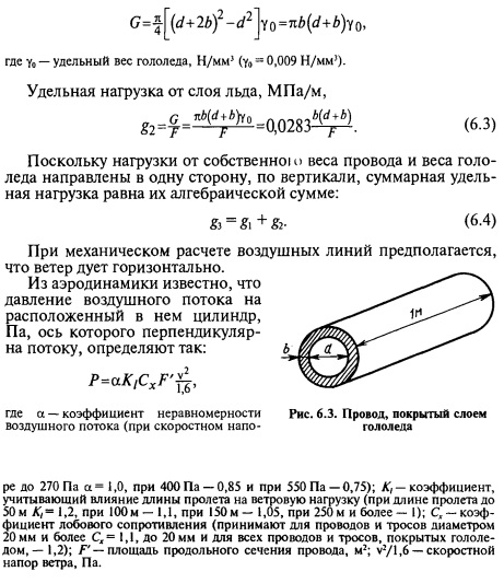 Для многопроволочных проводов, учитывая конструкцию провода, рекомендуют считать их длину на 2...3 % больше, т. е. вводить в уравнения (6.1) и (6.2) коэффициент, равный 1,02...1,03. При температуре окружающего воздуха, близкой к 0 °С, с последующим небольшим понижением температуры до —5 °С на проводах образуется гололед в виде слоя льда. При температуре ниже -5 °С он обычно не удерживается. Интенсивность образования гололеда зависит от высоты расположения данного места над уровнем моря, наличия незамерзших водоемов, способствующих созданию высокой влажности воздуха, и т. д. В некоторых районах гололед образуется очень интенсивно и его толщина достигает 50 мм. Это приводит к большим разрушениям воздушных линий. Их рассчитывают по фактическим условиям, а не по данным таблицы 6.1. Пусть провод диаметром d (рис. 6.3) покрыт слоем гололеда толщиной b. Тогда вес гололеда, Н, на проводе длиной 1 м