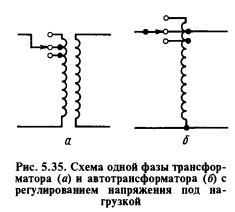 ПРИМЕНЕНИЕ СЕТЕВЫХ РЕГУЛЯТОРОВ НАПРЯЖЕНИЯ И КОНДЕНСАТОРОВСетевые регуляторы напряжения. Они регулируют напряжения в любых точках сети. Чем ближе регулятор к потребителю, тем эффективнее регулирование, но вместе с тем требуется большее число регуляторов в сети и выше их общая стоимость. В качестве регуляторов применяют трансформаторы или автотрансформаторы с изменением коэффициента трансформации под нагрузкой. Принципиальная схема трансформатора с регулированием напряжения под нагрузкой для одной фазы показана на рисунке 5.35, а. Выводы обычно делают со стороны обмотки высшего напряжения. Переключатель выполняют так, чтобы обеспечить переключение без разрывов цепи. Для такой схемы необходимо иметь специальный трансформатор. В ряде случаев используют обычные трансформаторы, а для регулирования применяют добавочные автотрансформаторы, включаемые в сеть (рис. 5.35, б).