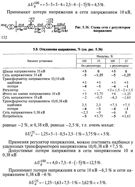 Выпускают трансформаторы мощностью от 560 кВ А и напряжением 35/10 KB с восемью ступенями регулирования по 2,5 % и, следовательно, с общим пределом регулирования ±10 %. От восьми ступеней обмотки сделано девять выводов, по контактам которых движется переключатель. Переключение происходит без разрыва цепи. В момент переключения соседние контакты замыкаются через реактор, который ограничивает ток до допустимого значения. Управление автоматизировано и ведется от реле напряжения. Точность поддержания напряжения на зажимах реле ±1,25 %. Время выдерживают с помощью моторного реле времени. Переключения выполняются электродвигателем постоянного тока напряжением 220 В. Схема питается постоянным током от аккумуляторной батареи или, что более удобно, от выпрямительной установки. Предусмотрено также ручное управление переключателем непосредственно на трансформаторе и дистанционное — со щита управления. Регулируемые трансформаторы типа ТМН имеют мощности 1000, 1600, 2500, 4000 и 6300 кВ А, пределы регулирования ±9 % (±6 • 1,5 %). Трансформаторы ТМН снабжены быстродействующими переключателями с малогабаритными активными сопротивлениями. В переключателях шесть ступеней тонкой регулировки и одна ступень грубой регулировки, равная половине диапазона регулирования. Регулятором поддерживается напряжение на выводах трансформатора неизменным, т.е. стабилизирует его на уровне 105 % U„, полностью компенсируя потерю напряжения в линии напряжением 35 кВ и самом трансформаторе. Технически вполне возможно встречное регулирование в широких пределах. Однако глубокое встречное регулирование эффективно только при совпадении графиков нагрузки всех потребителей данной подстанции. Выпускают регуляторы напряжения повышенной надежности. Составляют таблицу отклонений напряжения, выделяя жирным шрифтом известные значения (табл. 5.8). Для случая без регулятора получают допустимую потерю напряжения в сети напряжением 10 и 0,38 кВ, равную