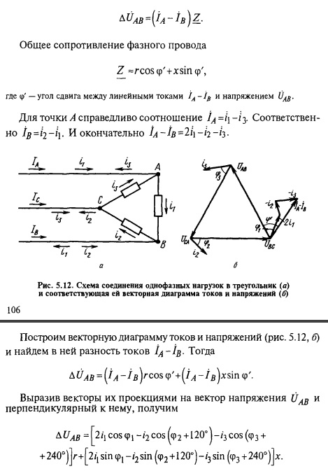 Пользуясь выведенными формулами, можно найти падение напряжения в любой трехфазной сети с неравномерной нагрузкой. Соединение однофазных нагрузок в треугольник. Если однофазные нагрузки в трехфазной сети соединить в треугольник (рис. 5.12, а), то в такой схеме нейтраль отсутствует и, следовательно, составляющей тока нулевой последовательности нет.