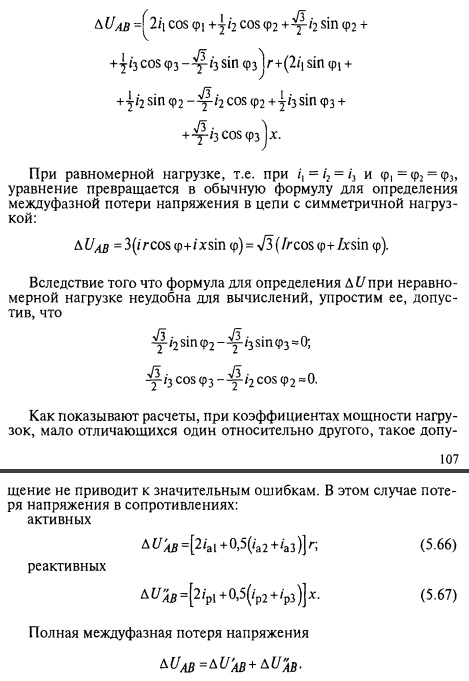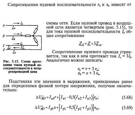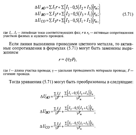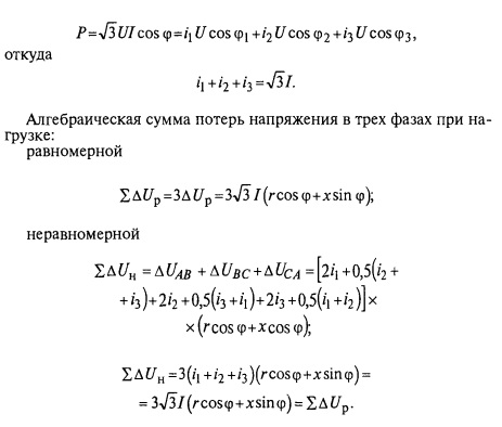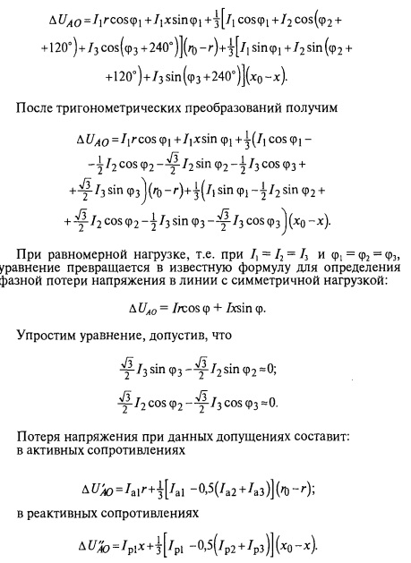 При равномерной нагрузке, второй член в каждом из уравнений становится равным нулю. Тогда уравнения превращаются в обычные выражения для фазной потери напряжения в симметричной трехфазной сети с активной нагрузкой. Сечения, а следовательно, и сопротивления фазных проводов обычно принимают одинаковыми. Ток нулевого провода, как правило, меньше фазного тока, поэтому сечение нулевого провода в ряде случаев можно брать меньше, чем фазного, но не менее 50 % его значения. Если на линии несколько нагрузок, то
