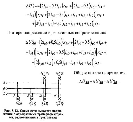 Трехпроводное ответвление четырехпроводной сети (две фазы и нуль). При трехпроводном ответвлении от четырехпроводной сети (рис. 5.16, а) ток в третьем фазном проводе, очевидно, отсутствует (например, 13 = 0). Потери напряжения в ответвлении определяют по уравнениям (5.70).