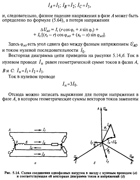 Таким образом, в трехфазной линии сумма потерь напряжения между фазами при данной передаваемой мощности есть величина постоянная, не зависящая от распределения нагрузок между фазами. Отсюда можно сделать важный вывод. Если неравномерную нагрузку распределить между фазами так, что все три междуфазные потери напряжения будут равны, то они также будут равны потере напряжения в этой линии при симметричной нагрузке. Соединение однофазных нагрузок в звезду. При соединении нагрузок в звезду (рис. 5.14, а) линейные токи равны фазным: