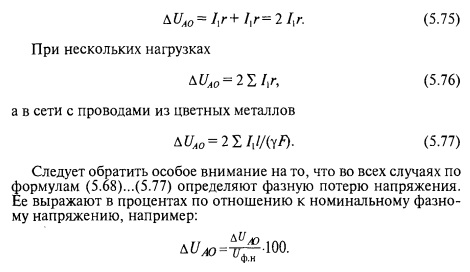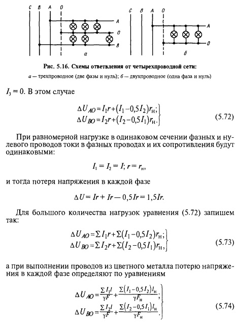 Двухпроводное ответвление от четырехпроводной сети (одна фаза и нуль). Многие потребители в сельских местностях имеют однофазное питание, и к ним подводят два провода — фазный и нулевой (рис. 5.16, б). К таким потребителям относят одноквартирные жилые дома, а также небольшие сооружения общественного и производственного назначения, не имеющие силовой нагрузки. В этом случае фазная потеря напряжения может быть найдена по уравнениям (5.70).