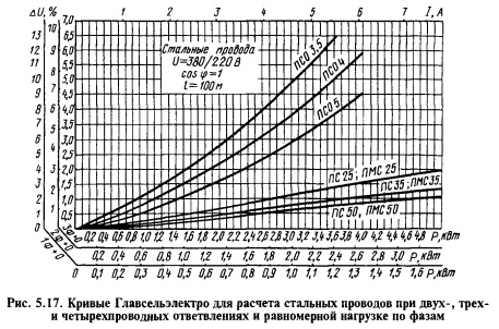 В практических условиях всегда стремятся так распределить однофазные нагрузки по фазам, чтобы в период максимальной нагрузки сети потери напряжения по фазам незначительно отличались одна относительно другой. Расчет значительно упрощается. Кроме того, потеря напряжения в этом случае получается наименьшей. Расчет стальных проводов в четырехпроводной сети сложнее, чем расчет проводов из цветных металлов. Для этой цели были составлены расчетные кривые. Кривые строят для трех-, четырех- и однопроводного ответвлений при условии практически равномерного распределения нагрузок между фазами. На рисунке 5.17 в качестве примера приведены кривые Главсель-электро для определения потери напряжения в четырехпроводных сетях. Кривые построены для ответвлений: три фазы — нуль, две фазы — нуль и одна фаза — нуль при коэффициенте мощности нагрузки cos ф = 1. Порядок пользования расчетными кривыми такой же, как и в трехпроводных сетях. Пятипроводная сеть. Для сельской электрификации широко применяют централизованное управление уличным освещением. Для этого прокладывают пятый — фонарный провод, соединенный через рубильник и предохранитель с одной из фаз. Всю нагрузку, включая нагрузку от уличного освещения, следует распределять равномерно между тремя фазами на каждой линии.