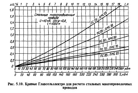 Рассмотрим порядок расчета стальных проводов. Расчет по кривым Главсельэлектро. Для облегчения расчетов были разработаны и используют расчетные кривые. На рисунке 5.10 приведен образец серии таких кривых для сети с номинальным напряжением 10 кВ, коэффициентом мощности нагрузки 0,8 и стальными многопроволочными проводами. По оси абсцисс отложена нагрузка на участке сети в амперах, киловаттах или киловольт-амперах, по оси ординат — потеря напряжения на 1 км линии в процентах от номинального напряжения. Для расчета сетей напряжением 380 В, 6, 10, 20 и 35 кВ нужно иметь полный набор таких кривых для разных коэффициентов мощности нагрузки и конструкций проводов (одно- и многопроволочных). Всего требуется более 30 серий кривых. Рассмотрим порядок расчета стальных проводов.