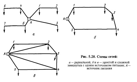 РАСЧЕТ ЗАМКНУТЫХ СЕТЕЙРадиальные и замкнутые сети. В сельском хозяйстве преобладают разомкнутые — радиальные электрические сети (рис. 5.20, а). При сооружении радиальных сетей требуется наименьший расход средств и материалов. Однако у них есть существенный недостаток. При повреждении линии, особенно в ее начале, прекращается электроснабжение всех потребителей, присоединенных к ней. В сельском хозяйстве появляется все больше потребителей, перерывы в электроснабжении которых приводят к значительным потерям урожая, животноводческой продукции и т.п. Электроснабжение ответственных потребителей должно быть надежным. Такому требованию радиальные сети удовлетворяют не полностью. Вот почему применяют замкнутые электрические сети. Замкнутой называют электрическую сеть, магистральные линии которой получают питание не менее чем с двух сторон. В этой сети (рис. 5.20, б) обрыв магистрали в любом месте не нарушает электроснабжения потребителей. Так, нагрузка 3 при обрыве линии на участке 2—3 будет получать питание по нижней ветви схемы, а при обрыве на участке 3—4—по верхней.