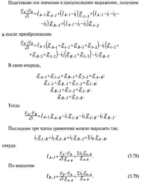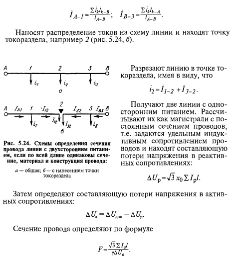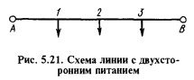 Линии с двухсторонним питанием. Пусть есть линия (рис. 5.23) с двумя источниками питания А и В и нагрузками. Обозначим токи, протекающие по участкам, сопротивления и длины участков соответствующими индексами.