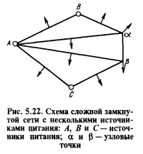 Если в сети будут проведены дополнительные внутренние линии A—2, А—3 и А—4 (рис. 5.20, в), то точки 2...4 получают питание с трех сторон и их называют узловыми или узлами, а сеть с узловыми точками — сложной замкнутой. В этой сети при обрыве линии на любом из участков электроснабжение всех потребителей более надежно, чем в простой замкнутой сети. Сети, изображенные на рисунке 5.20, б и в, снабжены источником питания А. При выходе его из строя прекращается электроснабжение всех потребителей этих сетей. Для повышения его надежности нужно увеличить число источников питания в сети. Простая замкнутая сеть с двумя источниками питания А и В (рис. 5.21) называется линией с двухсторонним питанием. В такой линии обрыв проводов и даже выход из строя одного из источников питания не нарушают электроснабжения всех или большей части потребителей электроэнергии. Сложная замкнутая сеть (рис. 5.22) с несколькими источниками питания обеспечивает наиболее высокую надежность электроснабжения.