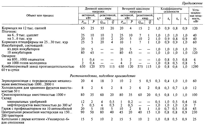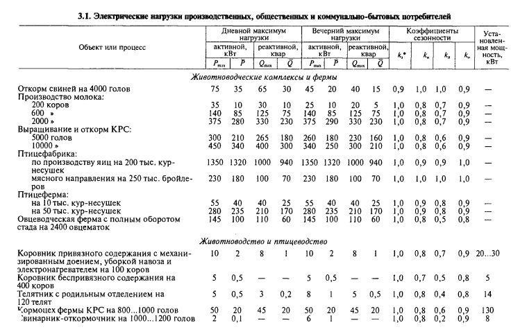 ВЕРОЯТНОСТНЫЕ ХАРАКТЕРИСТИКИ НАГРУЗОК СЕЛЬСКОХОЗЯЙСТВЕННЫХ ПОТРЕБИТЕЛЕЙ. РАСЧЕТ НАГРУЗОК ПО ИХ ВЕРОЯТНОСТНЫМ ХАРАКТЕРИСТИКАМНа основе многолетних экспериментальных исследований определены основные вероятностные характеристики нагрузок сельскохозяйственных потребителей. В качестве примера в таблице 3.1 приведены характеристики нагрузок ряда сельскохозяйственных объектов. В этой таблице для режимов вечернего и дневного максимумов нагрузки указаны средние значения активной Р и реактивной Q мощностей, т. е. их математические ожидания. Здесь же для указанных режимов приведены расчетные максимальные значения активной и реактивной нагрузок, вычисленные по формуле (3.13) при B = 2 по известным значениям среднеквадратического отклонения или дисперсии D = q2. Значения дисперсии можно получить из таблицы 3.1 по выражениям: