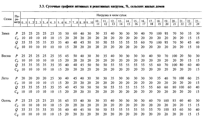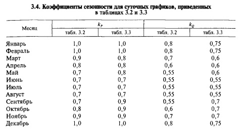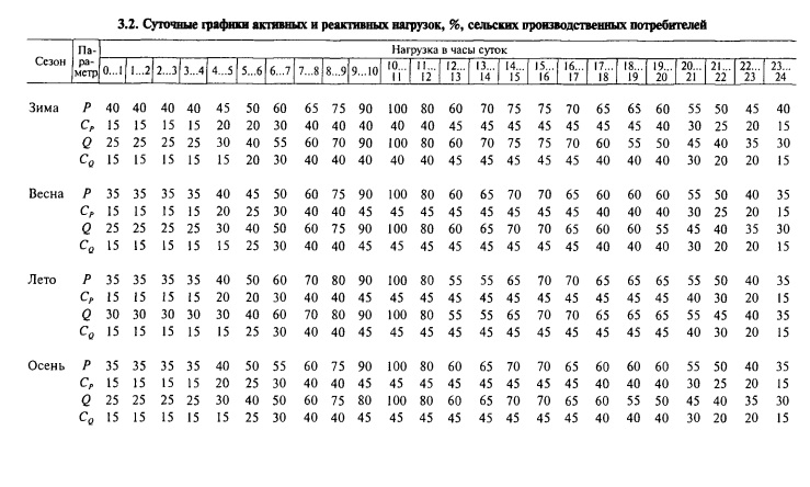 Расчеты сетей напряжением 10... 110 кВ по изложенной методике можно выполнить на ЭВМ. Для этого при подготовке исходных данных записывают на специальных носителях и вводят в ЭВМ характеристики и шифры потребителей, нагрузки которых должны суммироваться. Суммирование выполняют по типовым суточным графикам активной и реактивной мощностей. Некоторые из этих графиков приведены в таблицах 3.2 и 3.3. Коэффициенты сезонности активной и реактивной нагрузок для каждого месяца относительно годовой максимальной активной нагрузки приведены в таблице 3.4.