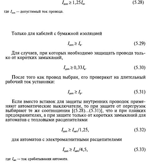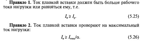 Очевидно, что для потребителей с небольшими пусковыми токами (асинхронные двигатели с фазным ротором) почти всегда большее значение тока плавкой вставки можно получить по правилу 1 из выражения (5.25). Для потребителей, пусковой ток которых практически равен рабочему (осветительные установки, тепловые потребители), ток плавкой вставки, определенный по правилу 1, также всегда больше тока, найденного по правилу 2. Определив номинальный ток плавкой вставки, выбирают соответствующее ему сечение провода в зависимости от того, будет он защищен плавкой вставкой только от коротких замыканий или также и от перегрузок. По правилам устройства электроустановок от перегрузок нужно защищать осветительные сети в жилых и общественных зданиях, торговых и служебно-бытовых помещениях промышленных предприятий, а также в пожаро- и взрывоопасных зонах. Сети любого назначения, выполненные проводами с горючей оболочкой, при открытой прокладке необходимо также защищать от перегрузок. Это относится к сетям любого типа во взрывоопасных помещениях. В перечисленных случаях необходимо выбрать такое сечение, чтобы было соблюдено следующее соотношение: