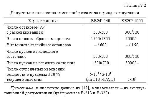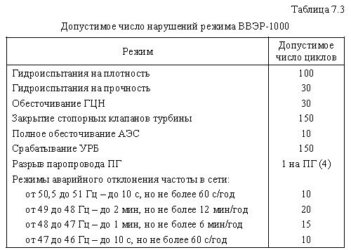 Допустимое число изменений режима (циклы)Сводная таблица, иллюстрирующая эту характеристику, дана ниже (табл. 7.2). В ней приведены данные, взятые из [20] и эксплуатационной документации энергоблоков. К сожалению, в последней, как правило, нет полного перечня возможных режимов. Помимо указанных режимов в регламентах ограничивается число различных отказов или нарушений нормальной эксплуатации, приводящих к повышенным скоростям изменения температур или другие режимы, вызывающие повышенные напряжения в оборудовании. Некоторые из них для ВВЭР-1000 указаны в табл. 7.3. ![]()