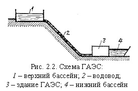 Гидроаккумулирующие станции (ГАЭС)ГАЭС являются уникальными высокоманевренными установками, посредством которых можно аккумулировать (запасать) электрическую энергию, возвращая ее в энергосистему по мере необходимости. Они предназначаются для снятия в первую очередь суточных пиков нагрузки в энергосистемах. Современные ГАЭС оборудуются обратимыми агрегатами, которые могут работать как в режиме «турбина-генератор», так и в режиме «двигатель-насос». В интервалы времени, когда электрическая нагрузка в ОЭС минимальна (ночью), агрегаты ГАЭС перекачивают воду из нижнего водохранилища в верхнее на высоту несколько десятков или сотен метров (рис. 2.2) и потребляют при этом энергию из энергосистемы (см. рис. 2.1). В течение непродолжительных пиков нагрузки, когда в энергосистеме образуется дефицит генерирующей мощности (преимущественно в утреннее и вечернее время), гидроагрегаты ГАЭС работают в генераторном режиме, расходуя запасенную в верхнем водохранилище воду.