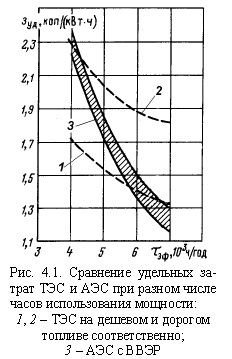 На рис. 4.1 представлены результаты экономических исследований, выполненных в 19841985 гг. [13]. Цифры, использованные при расчетах и показанные на графике, относятся к тому периоду времени. Но относительные тенденции прослеживаются достаточно четко: в районах с дорогим органическим топливом эксплуатация АЭС будет экономически оправдана и достаточно эффективна и при числе часов использования установленной мощности в год около 4000, а там, где топливо дешево, необходимое число часов работы АЭС существенно выше - 6000-7000. Более подробно материал можно посмотреть в [13]. Что же касается технической стороны, то однозначно можно сказать: по крайней мере, для некоторых типов АЭС работа в переменной части графика нагрузки возможна. Во Франции, где в 1970-х гг. было принято стратегическое решение о переходе на ядерную энергетику, сейчас на АЭС вырабатывается более 75 % электроэнергии, исследования маневренных возможностей АЭС с реакторами PWR (аналог наших ВВЭР) начались еще в те годы.