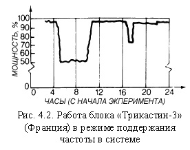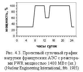 Была успешно продемонстрирована возможность привлечения таких энергоблоков к регулированию частоты в энергосистеме. Для примера на рис. 4.2 представлен график работы энергоблока № 3 АЭС «Трикастин» мощностью 900 МВт (эл.) летом 1983 г. в режиме следования за нагрузкой и регулирования частоты. В результате четвертое поколение французских АЭС с PWR мощностью 1400 МВт (эл.) с самого начала, а они начали строиться с 1984 г. проектируются с учетом такой работы. На рис. 4.3 показан проектный график суточной нагрузки, для работы в котором проектируются энергоблоки этих АЭС (по французской классификации - N4). Кстати, полная тепловая мощность реактора при работе в стационарном режиме - 4270 МВт, а на рис. 4.3 100 %-ная мощность соответствует 4056 МВт - на 5 % ниже максимальной. Это понижение номинальной мощности принципиально, так как дает возможность станции изменять свою нагрузку для регулирования частоты в системе как вниз, так и вверх. Из реакторов отечественной разработки в регулирующем режиме работает Билибинская АТЭЦ и некоторые блоки, поставленные в зарубежные страны, например, блоки ВВЭР-440 на АЭС «Ловиза» (Финляндия). Рис. 4.3. Проектный суточный график нагрузки французских АЭС с реакторами PWR мощностью 1400 МВт (эл.) (Nuclear Engineering International, feb. 1985)