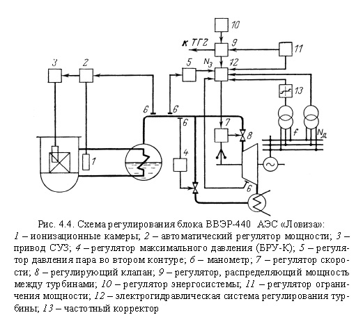 Объективной причиной привлечения с самого начала Билибинской АТЭЦ с канальными уран-графи- товыми реакторами к системному регулированию являлось то, что ее мощность составляла более 50 % мощности местной изолированной энергосистемы. Возможность привлечения обеспечивалась тем, что на этой станции твэлы, которые обычно являются самым «слабым» звеном в проблеме маневрирования, эксплуатируются при низких линейных энерговыделениях, а скачки мощности в твэлах при изменении нагрузки реактора невелики. Однако особенности блоков БАТЭЦ, по-видимому, не дают права распространить ее опыт на другие станции. Что же касается АЭС «Ловиза», то по условиям работы энергосистемы Финляндии эти блоки большую часть времени между перегрузками должны участвовать в регулировании графика нагрузки, изменяя свою мощность в диапазоне 50-100 % Nом со средней скоростью 1-2 % ^ом/мин, а также в быстром регулировании системных параметров - частоты и перетоков активной мощности в диапазоне 80-100 % ^ом, допуская изменения мощности на ± 5 % N^ с максимальной скоростью 0,2 ^ом/мин [39]. На рис. 4.4 представлена схема регулирования блока ВВЭР-440 АЭС «Ловиза» [39, 42]. Блок работает по программе с постоянным давлением во втором контуре. Принципы регулирования для этого случая подробно рассмотрены в теме «Стационарные режимы работы блоков АЭС» [15, 42]. Приводимая схема отличается от рассматривавшихся в [15] тем, что на ней указана взаимосвязь блока с энергосистемой. Описание, даваемое ниже, относится в основном к этой связи.