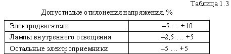 НапряжениеВ простейшем случае напряжение вдоль нагруженной ЛЭП, идущей от генератора электростанции к потребителю, меняется из- за потерь в сопротивлениях (рис. 1.4). При нормальном режиме работы сети подводимое к электроприемникам напряжение не должно отличаться от номинального ин (на рис. 1.4 это 6 кВ) больше чем на ± 5 %. Соответственно, как это показано на рис. 1.4, для поддержания нормального напряжения у потребителей напряжение на шинах генераторов держится на 5 % выше номинального, а на входных зажимах потребителя оно может быть ниже его также на 5 %. В реальных сетях используются трансформаторы, повышающие генераторное напряжение. В этом случае напряжение на выходных зажимах вторичной обмотки этих трансформаторов может быть ин + 5 %. Ограничения допустимого отклонения напряжения связаны с тем, что каждый потребитель электроэнергии рассчитывается для работы при определенном номинальном напряжении. При снижении его показатели работы потребителя ухудшаются. Например, при снижении напряжения на 5 % уменьшается производительность электрических печей и в 1,5-2 раза удлиняется время плавки; у асинхронных двигателей при снижении напряжения на 10% вращающий момент уменьшается на 19 %, следовательно, снижаются скорость и производительность механизмов; при снижении напряжения на 10% световой поток ламп накаливания снижается на 30%, а при повышении на то же значение срок службы ламп укорачивается в три раза. Поэтому установлены допустимые отклонения напряжения у зажимов разных электроприемников. Эти допустимые отклонения в нормальном режиме показаны в табл. 1.3.