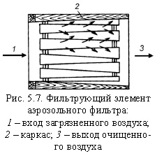 Очистка воздуха тонковолокнистыми фильтрами от аэрозолей происходит в результате их инерционного осаждения на волокнах, электростатического осаждения и прилипания частиц в поверхностном слое фильтра (когда диаметр аэрозолей больше расстояния между волокнами). Совместное действие всех этих процессов обеспечивает работу фильтра с эффективностью более 99,99 % при удельной нагрузке до 150 м3/ч воздуха на 1 м2 поверхности фильтра [20]. При конструировании фильтров стараются обеспечить компактность, максимальную фильтрующую поверхность, минимальное аэродинамическое сопротивление, герметичность конструкции и удобство замены. Эти качества достигнуты в рамочных фильтрах с прямыми или клиновидными (рис. 5.7) рамками.