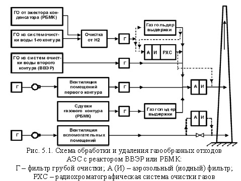 Основные подходы к обращению с ГРОВ гл. 2 обсуждались принципиальные подходы к обращению с любыми радиоактивными отходами. Однако обращение с газоаэрозольными отходами имеет свою специфику, на которой необходимо остановиться отдельно. Она в первую очередь связана с очень большим объемом вентиляционных выбросов - сотни тысяч кубометров в час. Такие объемы исключают возможность переработки и захоронения, как в случае жидких отходов. Для описания принципиальных подходов к обращению с РАО обычно используют термины «разбавление и рассеяние», «выдержка и распад» и «концентрация и локализация». Для ГРО особенно большое значение имеет первый из названных подходов. «Разбавление и рассеяние» - применительно к ГРО это выброс газов и аэрозолей в атмосферу таким образом, чтобы процесс выброса и условия окружающей среды обеспечивали перемешивание газов с атмосферным воздухом и снижение концентрации радионуклидов до уровней, при которых радиологическое воздействие выбрасываемых веществ окажется приемлемым. Такой подход является обоснованной практикой обращения с ГРО во всем мире и осуществляется с соблюдением допустимых пределов выбросов, определенных регулирующим органом. Для обеспечения его на всех АЭС предусматривается выброс воздуха в атмосферу через вентиляционные трубы, устье которых находится на высоте 100-150 м над поверхностью земли. Скорость воздуха в устье обычно выбирается не менее 10 м/с, кроме того, она должна в 1,5-2 раза превышать скорость ветра на той же высоте. Например, для АЭС с ВВЭР-440 на два блока сооружается одна труба высотой 120 м и диаметром в устье 3 м. Общий объем выбрасываемого через нее воздуха составляет 527 тыс. м3/ч при скорости выброса 20 м/с. Иногда вентиляционная труба выполняется двойной: в основной трубе размещается труба меньшего диаметра, используемая для удаления небольших объемов наиболее активного воздуха. Это позволяет увеличить скорость выброса ГРО, улучшая эффективность рассеяния и уменьшая вероятность срыва «факела», а также снизить требование к антикоррозионной защите основной трубы. По этому принципу выполнены, например, металлические вентиляционные трубы реакторных отделений блоков Балаковской АЭС. Внутренняя труба имеет диаметр 1,6 м, внешняя - 3 м. Внутренняя труба используется в нормальном режиме работы блока, когда удаляется немногим более 100 000 м3/ч воздуха. По проекту в нее организован также выброс из системы спецгазоочистки (см. разделе 5.4.2). Основная венттруба диаметром 3 м используется в режиме ремонтных работ, когда удаляется 280 000 м3/ч воздуха. Высокие вентиляционные трубы - важное средство защиты приземного воздуха от загрязнения ГРО. Газы и аэрозоли, попав в атмосферу, подхватываются воздушными потоками, перемешиваются с воздухом и под действием ветра уносятся от трубы. Свой вклад вносит и то обстоятельство, что температура выбрасываемых газов обычно выше температуры атмосферного воздуха, и газовая струя имеет направление вверх. Все это гарантирует многократное разбавление выбросов атмосферным воздухом и снижение удельной активности нуклидов в воздухе до приемлемых величин. «Выдержка и распад» подразумевает некоторую временную задержку ГРО перед выбросом их в вентиляционную трубу, в результате которой вследствие распада радионуклидов, содержащихся в отходах, происхо