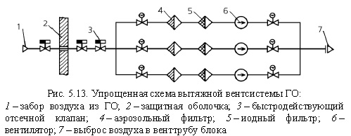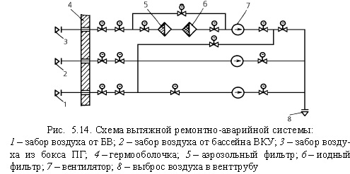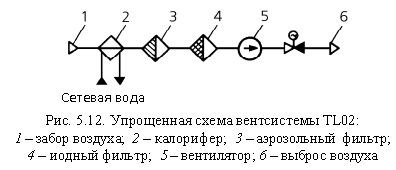 Подводя итог сказанному, отметим, что применение рециркуляционных вентсистем для отвода тепловыделений и очистки воздуха в этих помещениях ГО позволяет уменьшить объем воздуха, выбрасываемого в атмосферу, а следовательно, и количество радиоактивных выбросов. Действительно, расчетный объем ГО ~ 45 000 м3. По проекту общий расход воздуха в герметичной части реакторного отделения в режиме нормальной эксплуатации составляет более 340 000 м3/ч, а при остановленном реакторе более 620 000 м3/ч. Средняя кратность циркуляции достигает, соответственно, 8 и 12. С учетом же рециркуляции в режиме нормальной эксплуатации выбрасывается в атмосферу после тщательной очистки лишь 3000 м3/ч воздуха. Это обеспечивает минимальный выброс радиоактивных газов и аэрозолей. Для указанных целей и создания и поддержания необходимого разряжения воздуха в ГО во время работы энергоблока (15— 20 мм вод. ст.), обеспечения минимального воздухообмена и предотвращения скопления водорода в верхней части ГО предусмотрены вытяжная (система TL22) и приточная (TL42) вентиляция. У прощенная схема первой из них представлена на рис. 5.13. вентилятор каждой из них обеспечивает расход 3000 м3/ч. Система укомплектована 18 аэрозольными фильтрами (6 рабочих, 12 резервных) и 6 угольными иодными фильтрами (2 рабочих, 4 резервных). Они снижают активность выбрасываемого воздуха в 200-250 раз.