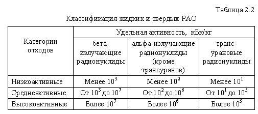 По удельной активности жидкие и твердые РАО согласно СПОРО-2002 и СП АС-03 разделяются на три категории (табл. 2.2).