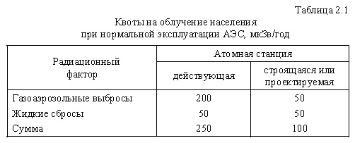 Приведенные в таблице значения рассматриваются как верхняя граница возможного облучения населения в режиме нормальной эксплуатации АЭС. Они используются для расчета соответствующих квот на облучение населения от предельно допустимых выбросов радионуклидов в атмосферу и предельно допустимых сбросов их в поверхностные воды. В качестве нижней границы дозы (порога дозы) при оптимизации принимается величина в пять раз меньшая - 20 мкЗв/год, ниже которой с учетом экономических и социальных факторов не требуется дополнительных мер по радиационной защите населения. Для расчетов годовых допустимых выбросов и сбросов радиоактивных веществ в окружающую среду обычно принимается следующее распределение указанной пороговой дозы: 10 мкЗв/год - на газоаэрозольные выбросы; 10 мкЗв/год - на жидкие сбросы. Исходя из этих последних величин, определяются допустимые концентрации отдельных радионуклидов или их смесей в сбросах и выбросах, выходящих за пределы станции. В последней редакции СП АС - СП АС-03 - квоты устанавливаются на суммарное облучение населения от радиоактивных газоаэрозольных выбросов в атмосферу и жидких сбросов в поверхностные воды в целом для АЭС, не зависимо от количества энергоблоков на ее площадке. Необходимо обратить внимание на выделенные жирным шрифтом слова, так как в более ранних редакциях СП АС нормировался выброс на 1 ГВт(э) мощности станции. Соответственно в изданной ранее литературе, например [28, 29], можно встретить ссылки на эти устаревшие нормы. Кстати, следует обратить внимание на то, что допустимые выбросы нормируются с точки зрения воздействия на человека. Считается, что если радиационное воздействие безопасно для человека, то оно безопасно и для других объектов биосферы. Наконец, последнее. Разные радионуклиды представляют, вообще говоря, разную опасность для человека. Она зависит от многих факторов, не последними из которых является суммарное количество образующихся ядер данного нуклида, период его полураспада и возможность накопления в тканях человеческого организма. Отсюда - будет ли его излучение потенциально значимо на фоне радиоактивности всей совокупности радионуклидов. С этой точки зрения выделяют биологически значимые нуклиды, которые и учитываются, когда решается вопрос о необходимости захоронения или возможности выбросов (сбросов) РАО в окружающую среду. |