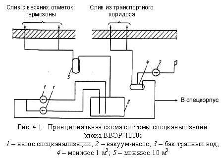 Система спецканализацииКак упоминалось выше, на АЭС, помимо обычных систем канализации (бытовой (хозяйственно-фекальной) и производственно - ливневой), предусматривается отдельная специальная канализация, предназначенная для сбора и транспортирования ЖРО на переработку или временное хранение. Специальная канализации (СК) включает в себя, во-первых, баки-накопители и изолированные от всех других систем трубопроводы для транспортировки радиоактивных стоков в эти баки, и, во- вторых, оборудование и трубопроводы для передачи собранных ЖРО из баков-накопителей к системам спецводоочистки (СВО) или в хранилища жидких отходов (ХЖО). Необходимость в системе СК возникает потому, что сброс жидкостей, содержащих радионуклиды, и ЖРО в системы, через которые они могут попасть во внешнюю среду, недопустим с точки зрения радиационной безопасности. Поэтому слив ЖРО в хозяйственно-фекальную или производственно-ливневую канализацию, в поверхностные водоемы, поглощающие ямы, колодцы, скважины, на поля орошения, поля фильтрации и на поверхность земли всеми нормативными документами категорически запрещается. СК состоит из нескольких подсистем, число которых определяется характером и степенью загрязненности радиоактивных вод: технологической (дебалансные и трапные воды, дезактивационные растворы и т.д.), от спецпрачечной, от установок очистки вод. Тем самым обеспечивается разделение (сортировка, по терминологии рис. 2.1) потоков разных по качеству и радиоактивности вод. Отдельно собираются ЖРО для временного хранения (с периодом полураспада менее 15 сут), горючие ЖРО и пульпы ионообменных смол, перлита и активированного угля. Баки для сбора ЖРО размещают на нижних отметках реакторных зданий для обеспечения самотечного слива. Их изготавливают из нержавеющей стали или железобетона с нержавеющей облицовкой. Емкость их определяется среднесуточным сбросом, максимально допустимым разовым сбросом и временем планируемого простоя установок СВО. Хранилища для ЖРО и общестанционные системы СВО обычно размещаются в отдельном здании или в спецкорпусе, где помимо СВО располагаются и помещения другого назначения (например, спецпрачечная, мастерские для ремонта загрязненного оборудования). В этом случае от здания реактора (от сборных баков) к этому корпусу прокладываются трубопроводы СК. Трубопроводы укладываются с обязательным уклоном в сторону слива. Причем трубопроводы для низкоактивных ЖРО допускается укладывать непосредственно в грунт, но выше уровня грунтовых вод на 0,5 м, а трубопроводы других категорий ЖРО прокладываются в железобетонных каналах или лотках с надежной гидроизоляцией и устройствами для контроля протечек, их сбора и удаления; конструкция их допускает также дезактивацию внутренних поверхностей. Для сбора протечек, попадающих в каналы и лотки, в конце линии СК устанавливают приемную гидроизолированную емкость. Передачу ЖРО из одной емкости для сбора или хранения их в другую рекомендуется осуществлять с использованием статического давления жидкости или газа (без применения насосов). Пример реализации системы СК (АЭС с несколькими блоками ВВЭР-1000) Система СК станции с блоками ВВЭР-1000 (рис. 4.1) предназначена для сбора неорганизованных протечек вод систем зоны строгого режима, а также сбора вод после наружной дезактивации 