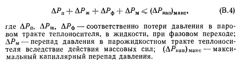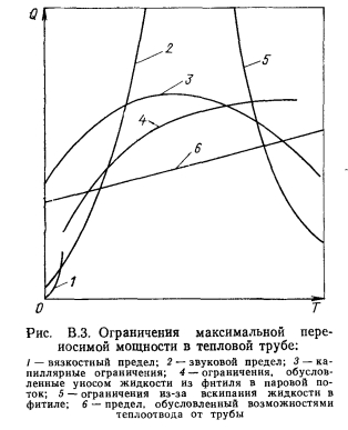 ОГРАНИЧЕНИЯ РАБОЧИХ ПАРАМЕТРОВ ТЕПЛОВЫХ ТРУБФизические процессы при работе тепловых труб накладывают ряд ограничений на их рабочие параметры. Рассмотрим в первую очередь те ограничения, которые определяют максимальную переносимую мощность и задают область параметров, где обеспечивается нормальная работа трубы (рис. В.З). Факторами, ограничивающими теплоперенос, могут быть: 1. Достижение потоком пара звуковой скорости в какой-либо части трубы, чаще всего в начале конденсаторной зоны. В этом случае говорят о звуковом пределе мощности трубы. 2. Способность данной капиллярной структуры обеспечивать циркуляцию данного теплоносителя только до определенного предела. Условились такие ограничения называть капиллярными ограничениями. В общем случае следует говорить о гидродинамических ограничениях. ![]() 3. Трение в паровой фазе при низких давлениях, ограничивающее циркуляцию теплоносителя и приводящее тем самым к возникновению вязкостного предела теплопереноса. 4. Унос жидкости из фитиля в паровой поток, который приводит к преждевременному наступлению капиллярных ограничений. 5. Вскипание теплоносителя и другие эффекты, приводящие к кризисным явлениям и ограничивающие допустимую плотность теплового потока в зоне нагрева. 6. Возможности теплоотвода от тепловой трубы. Для высокотемпературных тепловых труб (в частности, для Труб, работающих в контролируемой инертной среде при 7>1000°С) основную трудность представляет обеспечение длительной стойкости конструкционных материалов. Поэтому иногда говорят о седьмом ограничении, накладываемом на рабочие параметры тепловых труб, — ресурсе работы. Ресурс работы тепловой трубы ограничен коррозионной и механической стойкостью материалов стенки и капиллярной структуры, работающих в контакте с теплоносителем в условиях, как правило, напряженного состояния, усложненного влиянием высокой температуры. В зависимости от конструкции трубы, типа теплоносителя, уровня рабочей температуры и переносимой трубой мощности определяющим фактором может быть какое-либо одно из перечисленных ограничений. Коротко остановимся на перечисленных выше ограничениях параметров тепловых труб. При низких давлениях пара в трубе, когда удельные объемы пара велики, даже при относительно небольшом теплопереносе скорость пара в конце зоны испарения велика и может достигать скорости звука. В этом случае увеличение переносимой мощности только за счет улучшения условий теплоотвода становится невозможным, происходят дросселирование, звуковое запирание парового потока. Ограничение мощности, связанное с дросселированием потока пара при неизменной температуре в начале зоны нагрева, называют звуковым пределом. Звуковой предел мощности характерен для работы трубы в области низких давлений пара. Осевой поток тепла, ограниченный звуковым пределом, определяется параметрами пара в критическом сечении: ![]() Для тепловых труб с достаточно длинной зоной теплоотвода в области малых давлений пара, для которой характерны звуковые ограничения, возможно наступление вязкостного предела. Вязкостный предел наступает вследствие значительных потерь давления на трение в паровом потоке по длине трубы. В таком случае скорость звука может иметь место в конце зоны конденсации или вообще не достигаться. Замкнутая циркуляци