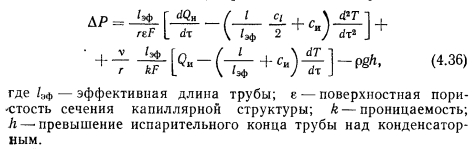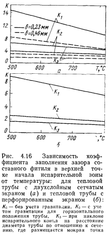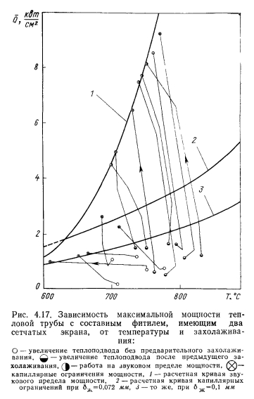 ОСОБЫЕ СЛУЧАИ ПУСКОВОЙ ДИНАМИКИЭксперименты по восстановлению работоспособности высокотемпературных тепловых труб. Тепловые трубы с составными фитилями, как уже подчеркивалось выше, легче теряют свою работоспособность и труднее ее восстанавливают, чем трубы с простыми фитилями. Когда нагрев осуществляется либо циркулирующим теплоносителем, либо .посредством конденсации пара, для восстановления работоспособности тепловой трубы с составным фитилем после осушения чаще всего необходимо захолаживание трубы. Для труб с различной конструкцией фитиля, различной геометрией и условиями теплосъема температура захолаживания различна. В опытах, проведенных авторами книги [8], для натриевой тепловой трубы с экраном в виде перфорированной трубки после осушения фитиля при температурах выше 680° С захолаживание необходимо было проводить до температур 660° С. и ниже. При температуре выше 670° С капиллярность зазора (6 = 0,5 мм) либо совсем не обеспечивает заполнения фитиля, либо скорость заполнения очень мала. Для заполнения фитиля необходимо отвести тепло, аккумулированное в конструкционных элементах зоны осушения фитиля. На рис. 4.16 представлены зависимости коэффициента К от температуры являющегося отношением капиллярного напора, развиваемого зазором для протока жидкости, к перепаду давления по парожидкостному тракту тепловой трубы. В величине потерь давления учитывалось влияние гидростатического столба жидкости. Коэффициент К, по существу так же как и к, является коэффициентом заполняемости капиллярной структуры, только в более ![]() ![]() Эксперименты проводились на тепловой трубе, установленной с небольшим наклоном против силы тяжести. Коэффициент заполняемости фитиля для максимального отклонения конца трубы от горизонтали (до 20 мм) против силы тяжести представлен зависимостью Кз Из расчетных оценок следует, что при температуре ниже 660—670° С фитиль с перфорированным экраном может заполниться при работе трубы с теплопереносом, соответствующим теплоотводу через постоянно вакуумируемый зазор. Это и подтвердили эксперименты. Если температура захолаживания после осушения фитиля выше 680° С, то фитиль трубы не может быть заполнен теплоносителем и труба не работает в режиме составного фитиля. Таким образом, для заполнения зазора фитиля с экралом в виде перфорированной трубки необходимо, чтобы /С>1. Выполнения этого условия недостаточно для заполнения составного фитиля с экраном из нескольких слоев сетки. Авторами проведены опыты на натриевой тепловой трубе с экраном из многослойной саржевой сетки [8]. Труба длиной 960 мм обогревалась на участке 350 мм, а теплоотвод осуществлялся на длине 460 мм. Диаметр парового канала составлял 12 мм. На рис. 4.16, б представлены зависимости коэффициента заполняемости фитиля данной трубы от температуры в горизонтальном положении под действием капиллярного напора, развиваемого зазором шириной 0,23 мм при работе тепловой трубы с теплопереносом, соответствующим теплоотводу к воде через вакуумируемую щель. Коэффициент заполняемости фитиля при работе трубы без учета гравитации Кi в диапазоне температур вплоть до 800°С весьма высок. Влияние сил гравитации хотя и существенно понижает коэффициент заполняемости, однако он остается высоким —- даже при работе трубы против сил тяжести при отклонении от горизо