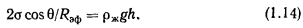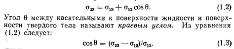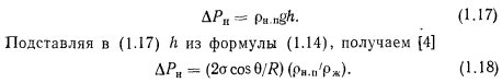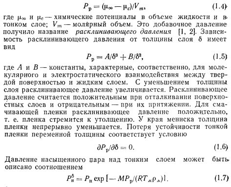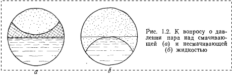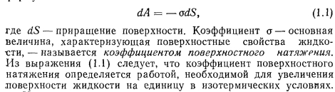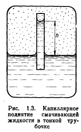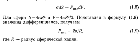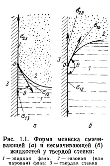 ПОВЕРХНОСТНЫЕ СИЛЫ И КАПИЛЛЯРНЫЕ ЯВЛЕНИЯПоверхностное натяжение. Поверхность жидкости, граничащая с другой средой, находится в особых условиях по сравнению с остальной жидкостью. Различие взаимодействия молекул поверхностного слоя жидкости с молекулами граничной среды приводит к динамической неуравновешенности, следствием чего является возникновение равнодействующей силы. Равнодействующая сила может быть направлена либо внутрь объема жидкости, либо в противоположную сторону — в сторону объема граничащей среды. Наличие равнодействующей силы, не равной нулю, приводит к тому, что перемещение молекулы жидкости из поверхностного слоя в окружающую среду или внутрь жидкости сопровождается совершением работы. Если жидкость граничит со своим паром, то сила, испытываемая молекулами поверхностного слоя, направлена внутрь жидкости. Это связано с тем, что плотность жидкости намного превышает плотность пара и сила взаимодействия поверхностных молекул жидкости с молекулами пара меньше этой силы со стороны жидкости. Поэтому перемещение молекул из объема жидкости к его поверхности требует затраты (отрицательной) работы. Отрицательная работа совершается и при увеличении поверхности жидкости, так как в этом случае часть молекул должна перейти из объема на поверхность, т. е. совершить работу против равнодействующей силы. Эта работа при изотермических условиях в дифференциальном виде выражается следующей формулой: ![]() Известно, что всякая система находится в равновесии, когда пребывает в состоянии с минимальной энергией. Жидкость в условиях равновесия должна иметь минимальную поверхность. Можно представить, что существуют силы, препятствующие увеличению поверхности. Они действуют по касательной к поверхности жидкости и стремятся сократить поверхность. Эти силы названы силами поверхностного натяжения . Они возникают в тонком поверхностном слое на границе раздела двух сред (или фаз) вследствие различного взаимодействия молекул. Из геометрических соображений следует, что поверхность жидкости минимальна, если кривизна ее в каждой точке одинакова. Этому условию соответствует сфера, форму которой стремится у2,- принять жидкость в равновесном состоянии. ![]() Поверхностное натяжение проявляется при соприкосновении жидкости с твердым телом. Форма жидкости в этом случае определяется соотношением трех сил действующих на жидкость н обусловленных наличием поверхностного натяжения. ![]() Краевой угол. При соприкосновении жидкости (область 1 на рис. 1.1) с твердым телом (область 3) и газовой средой (область 2) граница между фазами проходит по поверхностям, перпендикулярным к плоскости рисунка. К линии соприкосновения трех сред приложены три силы обусловленные взаимодействием. Краевой угол зависит только от природы трех соприкасающихся сред и не зависит от формы сосуда или силы тяжести. Из уравнения (1.3) т. е. поверхностное натяжение между газом и твердым телом» больше, чем между твердой поверхностью и жидкостью, то краевой угол 9 острый. Поверхность жидкости у твердой стенки приподнята и имеет погнутую форму мениска (см. рис. 1.1, а). В таком случае говорят, что жидкость частично смачивает твердую поверхность. При краевой угол 0 тупой, край жидкости опущен и ее .мениск выпуклый (см. рис. 1.1,6), т. е. жидкость не смачивает твердое тело. При полно