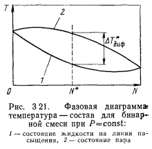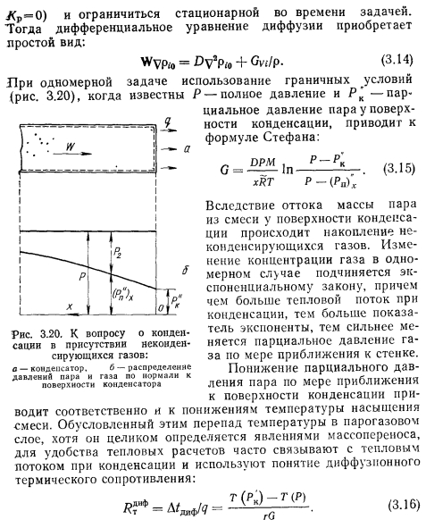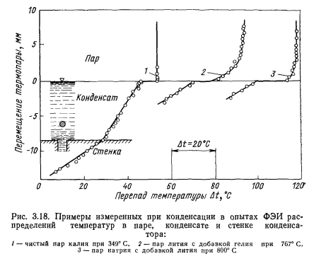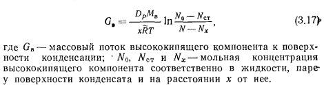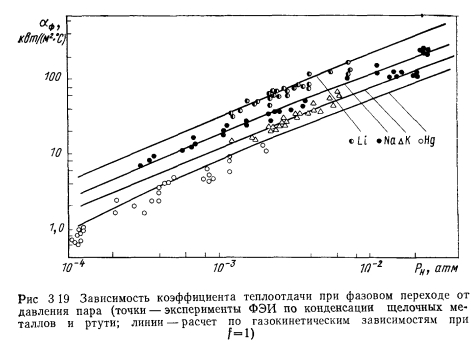 ТЕПЛО- И МАССООБМЕН ПРИ КОНДЕНСАЦИИНе останавливаясь на общих вопросах конденсации, которые детально изложены в литературе, обратимся к специфике процессов конденсации в тепловых трубах. Наибольший интерес применительно к тепловым трубам могут представлять следующие вопросы: 1) происходит ли теплоотвод на всей поверхности фитиля или лишь на поверхности менисков жидкости; 2) какова в процессе теплообмена при конденсации роль термического сопротивления фазового перехода; 3) какое влияние в процессе тепло- и массообмена при конденсации оказывают неконденсирующиеся газы; 4) какое влияние на тепло- и массообмен при конденсации оказывает многокомпонентность теплоносителя. Рассмотрим каждый из поставленных вопросов. Размер поверхности теплообмена при конденсации. Зачастую мокрая точка в тепловой трубе располагается либо в конце конденсаторной зоны, либо в средней ее части, и тогда часть поверхности фитиля может оказаться не закрытой менисками жидкости. Поскольку в тепловых трубах для фитилей используются смачиваемые материалы, то, согласно теории зарождения новой фазы, на обращенной в паровое пространство поверхности фитиля для образования жидкости практически не требуется переохлаждения и на ней образуется слой жидкости, из которого под действием капиллярных и других сил жидкость стекает в поры фитиля. В тонких слоях движение может осуществляться под действием расклинивающего давления. Однако, по-видимому, в большинстве случаев транспортировка конденсата с поверхности фитиля происходит за счет капиллярных и гравитационных эффектов, а также за счет трения о пар. Термическое сопротивление фазового перехода при конденсации. Сразу отметим, что для низкотемпературных жидкостей термическое сопротивление фазового перехода, как правило, ничтожно мало и его можно не учитывать. Для тепловых труб с жидкометаллическими теплоносителями оно может быть заметным лишь при низких давлениях пара. Это сопротивление следует учитывать для тепловых труб в пусковых режимах, а также для паровых камер, если они работают при пониженных давлениях пара. Как уже указывалось в § 3.1, для осуществления видимого процесса фазового перехода необходимо, чтобы условия равновесия между паровой и жидкой фазами были нарушены. При конденсации необходимо, чтобы температура насыщения пара была выше температуры поверхности жидкости. В тепловых расчетах удобно имеющийся при этом скачок температуры на границе пар—жидкость связать с понятиями термического сопротивления или коэффициента теплоотдачи при фазовом переходе и определить их как ![]() Массовый поток вещества в формуле (3 12) может быть вычислен при использовании зависимостей (3.1), (3.2), если известен коэффициент конденсации. Отметим, что при малой интенсивности фазового перехода аф не зависит от удельного теплового потока. Авторами проведены непосредственные измерения скачков температуры на границе раздела фаз для конденсации с постоянно обновляющейся поверхностью раздела [9] . С помощью подвижных термопар измерялось распределение температур в паровой области, в конденсате, наполнявшем ванночку-—-конденсатор, и в стенке конденсатора. При этом могли быть определены как теплоотдача на границе раздела фаз пар—жидкость, так и контактные сопротивления на границе раздела жидкий металл—твер