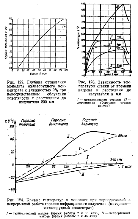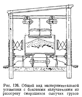 ПРИМЕНЕНИЕ ИНФРАКРАСНЫХ ИЗЛУЧАТЕЛЕЙ ДЛЯ ВОССТАНОВЛЕНИЯ СЫПУЧЕСТИ СМЕРЗАЮЩИХСЯ МАТЕРИАЛОВРабота промышленных предприятий, связанных с получением насыпных грузов железнодорожным транспортом, в зимнее время серьезно осложняется тем, что при перевозке грузов в условиях низких температур значительная часть этих грузов подвергается смерзанию и затрудняется их выгрузка. Особенно сильно смерзаются руды (всех видов), рудные концентраты, песок, уголь и ряд других грузов, которые зачастую превращаются в монолит. В связи с этим выгрузка их из вагонов связана с большими трудностями, с затратой длительного времени и большого количества рабочей силы. В связи с этим у нас в стране и за рубежом проводится целый ряд мероприятий, предупреждающих смерзаемость сыпучих грузов, а также разработаны устройства, обеспечивающие восстановление сыпучести грузов, перевозимых железнодорожным транспортом и прибывающих в пункты назначения в смерзшемся состоянии. В порту Толедо (США) была смонтирована установка, оборудованная газовыми горелками инфракрасного излучения. С обеих сторон железнодорожного пути установили 36 генераторов излучения так, что их лучи направлены непосредственно на стенки вагонов. Топливом для горелок служил пропан. Применение этого способа позволило разогревать смерзшийся уголь почти вдвое быстрее, чем при разогреве угля паром в тепляках. Затраты на топливо снизились примерно на 40%. В порту Ту-Харбора (США) была также введена в эксплуатацию установка, позволяющая разогревать смерзшуюся руду с помощью инфракрасных лучей до полного восстановления ее сыпучести. Каждый вагон обогревали 48 генераторов инфракрасных лучей, смонтированных на специальных приспособлениях (в вагонных позиционерах). Генераторы работали на пропане и природном газе. Газовоздушную смесь на верхних генераторах зажигали электроискровым способом, а на остальных — вспомогательными горелками. Смесительные камеры горелок оборудованы соленоидными клапанами с электроприводом для регулирования подачи газа и воздуха, а также системой автоматического отключения подачи газа. Боковые генераторы инфракрасных лучей этой рудоразмораживающей установки отличаются от генераторов, установленных в предыдущем случае меньшими размерами и значительно большей площадью керамических насадок. Изменение конструкции боковых генераторов дало возможность расположить их в нижних рядах ближе к стенкам вагонов и направить поток инфракрасных лучей на участки наибольшего промерзания руды. Для обеспечения концентрированного направления инфракрасных лучей на обогреваемые ими стенки вагонов и на руду боковые и верхние генераторы оборудованы параболическими отражателями. Установка для разогрева смерзшейся руды работает следующим образом: при подаче вагонов с рудой к установке определяют толщину смерзшейся руды, затем оператор, получив сообщение о прибытии руды и степени ее смерзаемости, автоматически открывает ворота установки и включает сигнал на подачу вагонов на место разогрева. По окончании подачи вагонов до специального упора оператор по громкоговорящей связи дает указание обслуживающему персоналу отсоединить от вагонов локомотив и покинуть здание установки. Ворота в здание он может закрыть после того, как локомотив будет удален от здания примерно на 