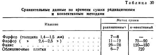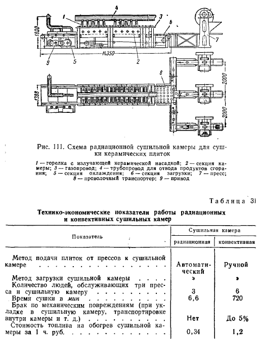 ПРИМЕНЕНИЕ ИНФРАКРАСНЫХ ИЗЛУЧАТЕЛЕЙ В КЕРАМИЧЕСКОЙ ПРОМЫШЛЕННОСТИПродолжительность сушки керамических изделий (фарфора, фаянса, облицовочных плиток и др.) конвективным методом весьма значительна. Существующие сушильные установки громоздки, ненадежны в эксплуатации и не дают возможности применить автоматическое управление сушкой и создать поточные автоматические линии производственного процесса. Длительные сроки сушки изделий тонкой керамики определяются не технологическими требованиями, а конструктивными и теплотехническими недостатками сушил, в которых используется конвективно-тепловой метод сушки изделий в общем потоке. Большие возможности интенсификации процесса сушки открываются при радиационном нагреве. При этом достигается практически полное удаление влаги из изделий, что важно для повышения механической прочности полуфабриката, особенно при однократном обжиге фарфора, фаянса и облицовочных плиток. В институте газа АН УССР проведены исследования радиационной газовой сушки изделий тонкой керамики. Для сушки изделий были использованы газовые горелки с излучающим керамическим насадком. При исследовании радиационной газовой сушки изделий тонкой керамики фарфор производился методом отливки в гипсовые формы массой со следующей характеристикой: абсолютная влажность шликерной массы составляла 45—46%, толщина черепка 1,5—1,6 и 2,4—2,5 мм. Фаянсовые изделия изготовлялись методом формовки на ручных станках и полуавтоматах из массы фаянсового завода (абсолютная влажность формовочной массы составляла 32—33%, толщина черепка — 4,5—5 мм). Облицовочные плитки изготовлялись на колено-рычажных прессах из пресс-порошка плиточного завода (абсолютная влажность пресс-порошка была 9—10%, толщина плиток — 4,8— 5 мм). Экспериментальные данные по радиационной газовой сушке изделий тонкой керамики и их сравнение с существующими в тонкокерамической промышленности показателями приведены в табл. 30. (длительность сушки в мин). ![]() Анализ табл. 30 показывает, что радиационный метод позволяет в 5—10 раз сократить длительность сушки керамических изделий. Используя радиационную сушку, можно, кроме того, легко достигнуть предельных скоростей сушки. Сушильная камера (рис. 111), разработанная Харьковским плиточным заводом, имеет с учетом вспомогательных устройств: привода, натяжной станции и т.д.), длину 14,35, высоту 1,8, ширину 1,38 м. Сушильная камера сваривается из профильной и угловой стали. Стены и под теплоизолированы. Газовые горелки устанавливаются на своде. Камера имеет конвейер с проволочной лентой шириной 1,1 м с толщиной проволоки 2,5—3 мм. Вне камеры проволочная лента движется на роликах, а в камере — на чугунных плитах, являющихся ее подом. Скорость движения ленты 0,028 м/сек. ![]() Одна сушильная камера может автоматически загружаться плитками от трех прессов одновременно. Производительность печи 73,5 м2 плиток в 1ч (18 плиток в 1 мин от каждого, пресса). В табл. 31 приведены технико-экономические показатели радиационной и конвективной сушильных камер. Инфракрасный нагрев нашел применение при изготовлении тонкой керамики. В этом случае материал прогревается на малую толщину (излучение оказывает только поверхностное действие). При поточном изготовлении тарелок инфракрасные лучи позволяют резко повысить производительность, сократить вре
