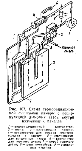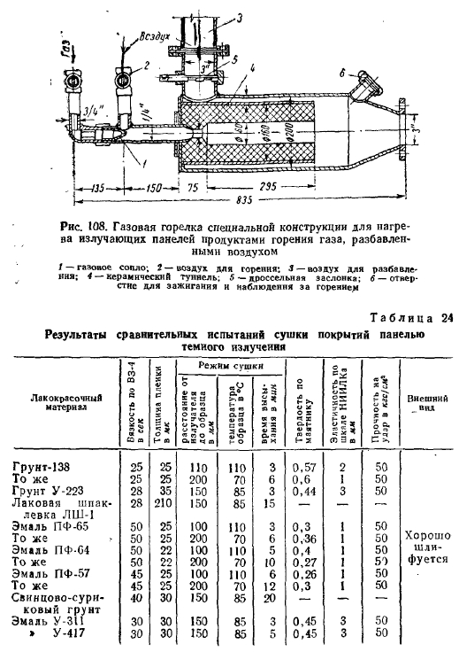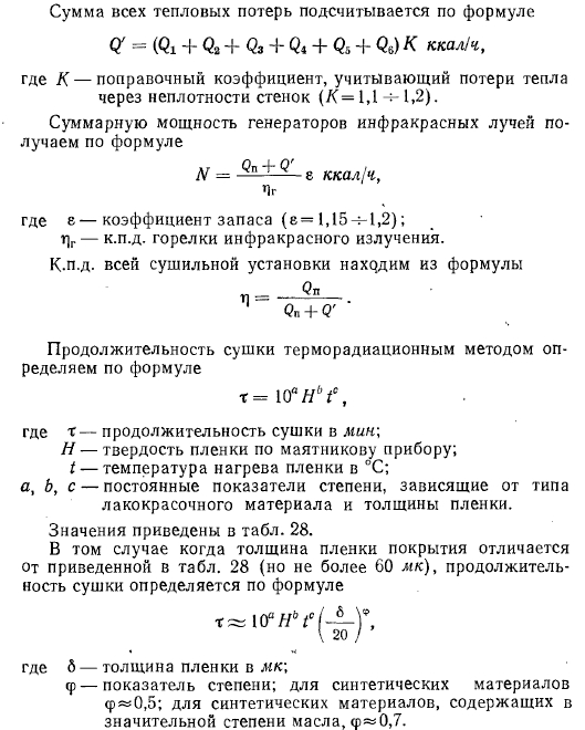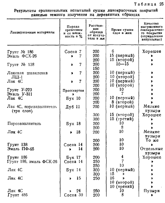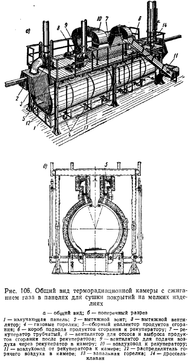 ПРИМЕНЕНИЕ ИНФРАКРАСНЫХ ИЗЛУЧАТЕЛЕЙ ДЛЯ СУШКИ ЛАКОКРАСОЧНЫХ ПОКРЫТИЙПервые промышленные установки для сушки лакокрасочных покрытий с помощью лучистой энергии были сооружены на автомобильных заводах, и с тех пор в автомобильной промышленности инфракрасной сушке принадлежит основное место. Повысилось качество окраски кузовов автомобилей и резко сократилось время сушки, что особенно важно в поточном производстве. Здесь процессы окраски и сушки изделий должны протекать непрерывно. Современные инфракрасные сушильные установки на автомобильных и других заводах представляют собой туннели, на внутренних поверхностях которых установлены светлые или темные излучатели. Сушка окрашенного автомобиля в таком туннеле длится всего примерно 10—15 мин. Камера оборудована приточно-вытяжной вентиляцией. Кузова автомобилей омываются потоком нагретого воздуха. Такое сочетание конвективного и инфракрасного методов сушки значительно экономит тепловую энергию. Сушка эмали инфракрасными лучами происходит в камере при более низкой температуре внутреннего воздуха в ней, чем при конвективной сушке. Это позволяет избежать порчи приборов, которые могут быть смонтированы до момента сушки покрытия. Вместе с тем температура подложки достигает требуемых значений. Метод инфракрасного нагрева незаменим для сушки последнего наружного слоя лака на собранных автомобилях. Инфракрасные лучи так быстро просушивают отделочный слой, что не успевают повредить не теплостойкие детали. Форма сечения рабочего пространства сушильной установки может быть приспособлена к форме поверхности автомобиля, и потому сушка происходит равномерно по всей ее площади. Кроме того, в этих сушилках можно ремонтировать покрытия на автомобильных кузовах, используя такие же эмали, какие применялись при первой окраске их, и производить сушку, не удаляя стекол, подушек и приборов. Для этих целей может быть использована и передвижная сушильная установка, имеющая форму дугообразного свода и оборудованная генераторами инфракрасных лучей, медленно перемещающаяся на резиновых шинах над автомобилем, высушивая лак на только что отремонтированных местах. Светлые излучатели в этом случае незаменимы, благодаря безынерционному включению и выключению. При сушке искусственных смоляных лаков взрывоопасность не так велика; для полного затвердевания пленки лака необходимо,. однако; нагревать ее до температуры 120—150° С. Использование инфракрасного излучения позволяет легко решить эту задачу. При этом удается достигнуть резкого сокращения времени сушки, что является важнейшим фактором в современном поточном производстве. Сушка инфракрасными лучами мало применима для лаков, содержащих большое количество масла, так как одновременно с сушкой обычно протекает процесс окисления, который не может быть ускорен за счет нагрева. Сушка нитролаков происходит в естественных условиях, так как растворитель испаряется уже при комнатной температуре. Сушка же синтетических и пентафталевых эмалей осуществляется при температуре 120—150° С. От правильно выбранного режима сушки зависят механические и защитные свойства покрытий: твердость, стойкость к удару, адгезия, эластичность, водостойкость и др. До последнего времени широко использовались электрические инфракрасные сушильные устан