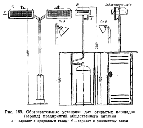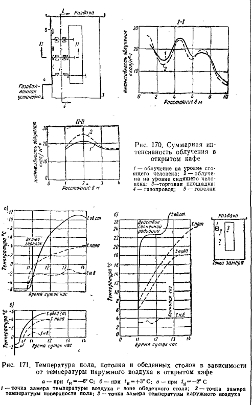 ПРИМЕРЫ ОБОГРЕВА ОТКРЫТЫХ ПЛОЩАДОК И РАБОЧИХ МЕСТВ зарубежной практике сравнительно широко применяется обогрев людей на открытых площадках, например, на остановках городского транспорта, на тротуарах перед витринами магазинов, на трибунах открытых стадионов и т. д. В отечественной практике в настоящее время также начинает внедряться обогрев открытых площадок и рабочих мест. Институтом Мосгазпроект разработаны конструкции обогревательных установок для открытых веранд предприятий общественного питания в виде торшеров (рис. 169). В архитектурно оформленной тумбочке-подставке помещается баллон сжиженного газа с редуктором. Обогреватель устанавливается в центре обеденного стола, и газовые горелки инфракрасного излучения, укрепленные на концах трубок-стеблей, облучают сидящих за столом людей. В Москве на одной из улиц устроено открытое кафе. Торговый зал в виде открытой заасфальтированной площадки размером 9x19 м имеет сверху покрытие из рифленого стеклопластика, укрепленное на металлическом каркасе, опирающемся на стальные стойки из труб. Торговая стойка с производственными отсеками примыкает к торцу площадки. ![]() Площадка облучается газовыми горелками инфракрасного излучения производительностью 2250—2500 ккал/ч каждая. Горелки размещены под навесом на высоте примерно 3 м от пола (на 300—400 мм от покрытия) с наклоном 50—70° к поверхности пола. Горелки питаются сжиженным газом от групповой газобаллонной установки, расположенной рядом с торговой площадкой в железном шкафу. Обследование, проведенное лабораторией энергетического использования газа ВНИИГаз данного кафе, показало следующие результаты. ![]() Максимальная суммарная интенсивность облучения (рис. 170) составляет 25—30 ккал/м - ч, минимальная — 5—10 ккал/м2-ч. Максимальная температура поверхности обеденных столиков не превышала 11° С при температуре наружного воздуха —6° С (рис. 171) и 23° С при температуре наружного воздуха +3°С. При этом выявилось, что солнечная радиация значительно влияет на температуру поверхности стола и поднимает ее при этих условиях до 30° С. Максимальная температура пола не превышала соответственно 4 и 20° С. Температура потолка не превышала 25° С. Одновременно с этим было установлено, что стабильность температуры поверхности пола, потолка и обеденных столов наступает примерно через 2—3 ч работы горелок Температура тыльной части горелки при температуре наружного воздуха —2° С не превышает 80° С. При данных условиях подавляющее большинство посетителей, сидящих за столиками под горелками, отзывались положительно о своих тепловых ощущениях. При временном обогреве на открытых площадках могут быть использованы передвижные установки инфракрасного излучения (см. рис. 112 и 113), используемые для сушки штукатурки. Описанная установка серийно выпускается предприятиями Министерства газовой промышленности СССР и уже широко используется в народном хозяйстве для обогрева сварочных постов, мест изоляций при монтаже наружных трубопроводов, рабочих мест монтажников, каменщиков, штукатуров и т. д. при проведении строительно-монтажных работ на открытых площадках в холодное время года. Надо полагать, что по мере накапливания опыта в разработке и применении горелок инфракрасного излучения для обогрева открытых площадок и рабочих мест, а также расширения их произ