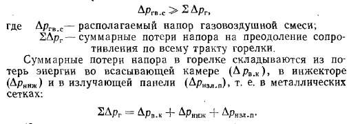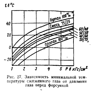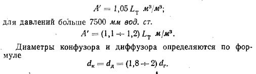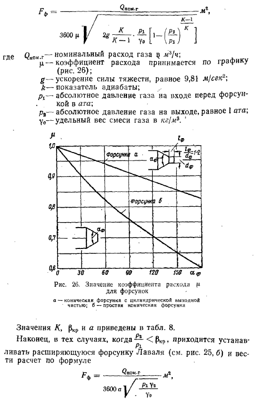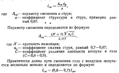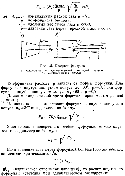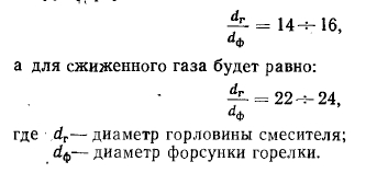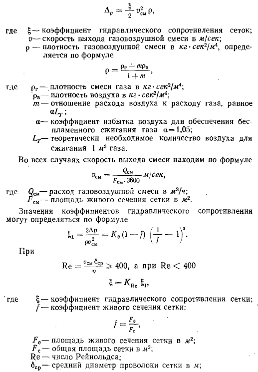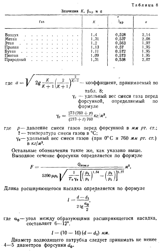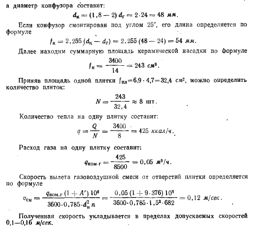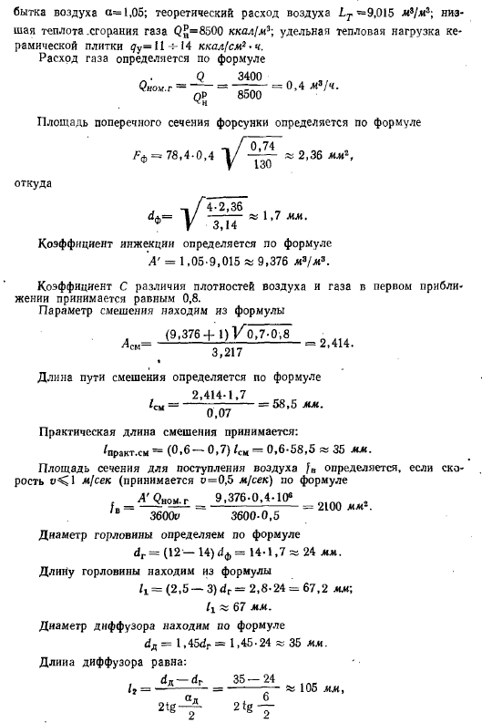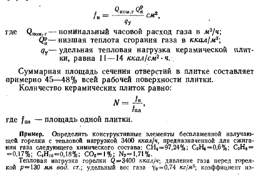 РАСЧЕТ ГАЗОГОРЕЛОЧНЫХ УСТРОЙСТВ ИНФРАКРАСНОГО ИЗЛУЧЕНИЯРасчет беспламенных излучающих инжекционных горелок инфракрасного излучения сводится к определению следующих величин: площади поперечного сечения форсунки, основных размеров инжекционного смесителя и суммарного сечения отверстий в керамических плитках. Исходными данными для расчета являются: расход газа; тепловая нагрузка горелки Q ккал/ч; давление газа перед горелкой р в мм вод. ст.; удельный вес смеси газа коэффициент избытка воздуха; теоретический расход воздуха LT в мг/мг; коэффициент инжекции; удельная тепловая нагрузка керамической плитки, принимаемая по опытным данным и химический состав газа. ![]() ![]() ![]() Для хорошо выполненной форсунки коэффициент расхода, практически равный коэффициенту скорости, должен быть не менее 0,95—0,98. ![]() При сжигании сжиженного газа следует иметь в виду, что при работе на среднем давлении газ получает большую скорость на выходе из форсунки. Часть потенциальной ti С энергии газа переходит в кинетическую. Температура ее понижается и возникает опасность конденсации паров сжиженного газа. Минимальная температура газа перед форсункой, необходимая для работы без конденсации паров сжиженного газа, определяется по графику (рис. 27). В горелках инфракрасного излучения инжекционного типа струя газа, выходящая из форсунки с большой скоростью, инжектирует воздух, необходимый для сгорания газа (см. рис. 13). Длина пути смешивания газа с воздухом, которая зависит от расположения форсунки по отношению к смесительной камере, определяется по формуле ![]() ![]() Диаметр выходных отверстий керамической плитки в зависимости от состава сжигаемого газа равен 0,8—1,6 мм. При этом скорость выхода газовоздушной смеси должна быть в пределах 0,1—0,16 м/сек. ![]() ![]() ![]() Полученная скорость укладывается в пределах допускаемых скоростей 0,1—0,16 м/сек. Экспериментальная проверка горелок инфракрасного излучения с металлическими сетками показывает, что они могут работать на газе низкого и среднего давлений любой теплоты сгорания, если ![]() ![]() ![]() ![]() Однако коэффициент гидравлического сопротивления сеток, расположенных одна на другой, не равен сумме коэффициентов гидравлического сопротивления отдельных сеток. При расположении сеток на расстоянии 10 мм друг от друга суммарный коэффициент гидравлического сопротивления несколько увеличивается, так как при этом возникает дополнительное сопротивление от внезапного расширения потока. Следовательно, организация беспламенного сжигания газа в горелках с металлическими сетками требует или изменения конструкции горелок в части снижения их сопротивления, или увеличения давления газа перед горелками. Расчет излучающих горелок с пористыми плитками производится по формулам для инжекционных горелок среднего давления. Для природного газа отношение диаметра горловины к диаметру форсунки составит: ![]() Испытания излучателей при сжигании природного и сжиженного углеводородного газа показали, что они удовлетворительно работают на обоих видах газа без каких-либо существенных переделок. Для давлений до 7500 мм вод. ст. кратность инжекции принимается ![]() Количество пористых излучающих плиток размером 115Х115X40 мм находят как частное от деления номинальной тепловой нагрузки горелки на фактическую- номинальную тепловую нагрузку одн