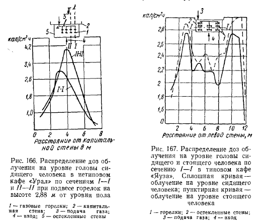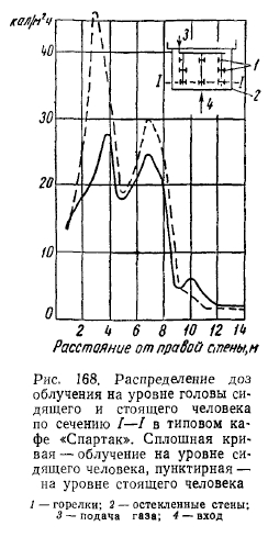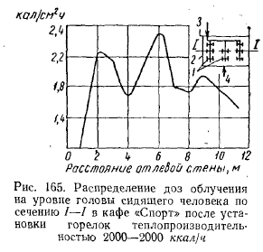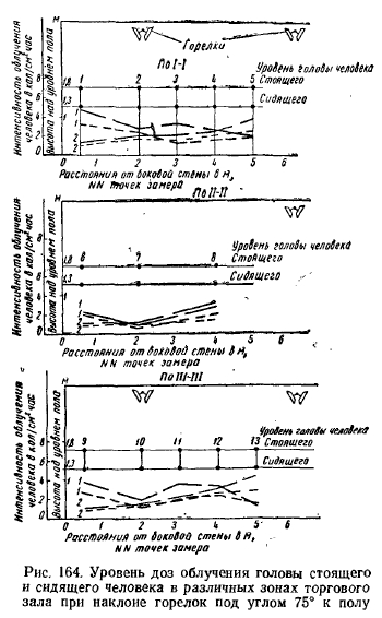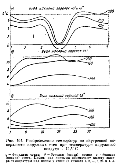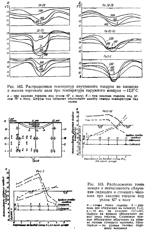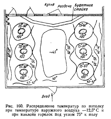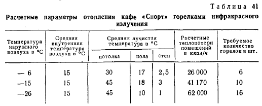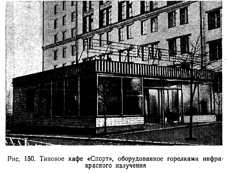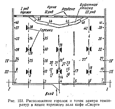 РЕЗУЛЬТАТЫ ИСПЫТАНИЯ ОПЫТНЫХ СИСТЕМ ОТОПЛЕНИЯ ЗДАНИИ ЛЕГКОГО ТИПА ГОРЕЛКАМИ ИНФРАКРАСНОГО ИЗЛУЧЕНИЯСовременная техника строительства, новые архитектурные решения конструктивных элементов зданий, сооружаемых из сборного железобетона, стекла, легких металлических сплавов и пластиков, требуют более гибкого экономически эффективного решения системы отопления. Стены из стекла и металла не только придают зданию лег- кость, но и дают много света. Однако при обычном (конвективном) отоплении в холодное время создают дискомфортные условия для людей, пребывающих в этих зданиях. Стекло и металл, как известно, имеют высокие коэффициенты теплопроводности, что обусловливает сравнительно низкие температуры на их поверхности с внутренней стороны помещений. Повысить температуру этих поверхностей конвективными системами отопления без значительных затрат топлива невозможно (вследствие низкого коэффициента теплопроводности воздуха). К тому же нагрев конструкций в этом случае связан с нагревом всего объема воздуха в помещениях. Решение задачи отопления зданий, выполненных из указанных материалов, т. е. создания комфортных условий для людей, находящихся в этих зданиях, значительно облегчается с применением газовых горелок инфракрасного излучения. В Москве по проектам института Мосгазпроект были осуществлены системы отопления горелками инфракрасного излучения в нескольких-зданиях общественного питания, выполненных в основном из стекла и алюминиевых сплавов. Первым таким зданием было кафе «Спорт» (рис. 150), по типу которого в дальнейшем сооружались многие другие здания того же назначения. ![]() Здание состоит из двух частей: торгового зала с буфетной стойкой и служебного отделения (кухня, мойка, кладовые). Торговый зал имеет площадь 108 м2 (12X9), высоту 3,5 м, объем ~380 м2. Стены служебного отделения выполнены из дырчатого кирпича (толщина 38 см), торгового зала также из дырчатого кирпича в пределах цоколя высотой 60 см над полом и из стекла толщиной около 1,5 см, обрамленного рамой из алюминиевого сплава с уплотнением резиновой прокладкой. Над рамой имеется карниз из железобетона. С фасада торгового зала имеется стеклянная дверь, открывающаяся в обе стороны. Пол бетонный по грунту с облицовкой метлахской плиткой. Перекрытие сборное из железобетонных плит, уложенных по металлическим балкам, с утеплением шлаковатой. Потолок в торговом зале выполнен из рифленых алюминиевых листов. Между перекрытием и потолком имеется зазор в 60 см, образующий общий вытяжной вентиляционный короб. В потолке устроены решетки для вытяжки продуктов сгорания от горелок. Горелки укреплены на расстоянии около 350 мм (до поперечной оси симметрии) от потолка в виде спаренных бра по трем рядам (рис. 151) так, что от внешнего ряда до наружной стены расстояние составляет 2 м, а между рядами—4 м. Первоначально было установлено (по проекту) в торговом зале 18 горелок института Мосгазпроект производительностью 4300 ккал/ч каждая, но ввиду сильного облучения буфетчиц, вызывающего жалобы последних на головные боли и порчу продуктов (размягчение масла и пирожных, свертывание сыра и колбасы на бутербродах и т. д.), 4 горелки, расположенные над буфетной стойкой, были сняты. При составлении проекта был произведен расчет теплолотерь зданием по общепринятой методике для радиаторных систем 